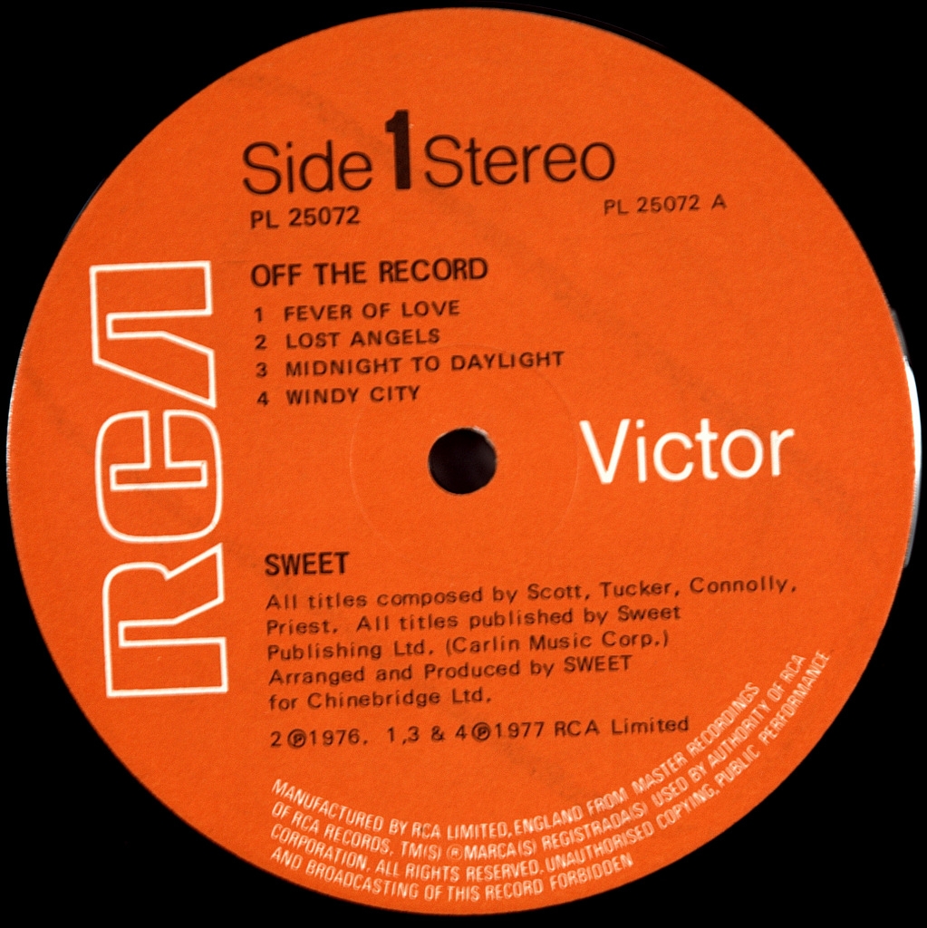 SWEET-OFF THE RECORD-1977-FIRST UK PRESS-RCA-PL25072 matrix A-2/B-1 .Rare British original. "Off the Record" - the fourth "hard-rock" album by Sweet. Recorded in the winter of 1977 (although the appointment was made in October 1976) in London (Studio "Audio International Studios"). Released on RCA records in April of the same year. The film was produced by the musicians themselves. This album laid the Foundation for the next three albums. Immediately after the release of the album, the band terminated the contract with RCA and moved on to bigger and more famous label Polydor, which released its last four albums.