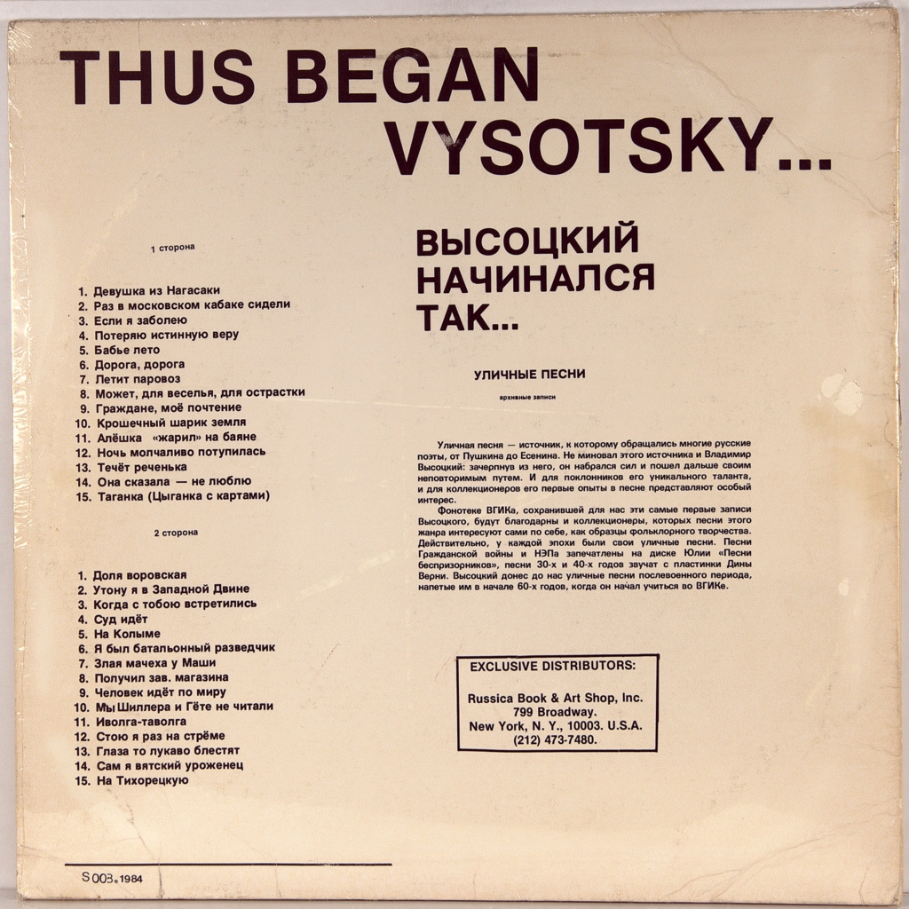 VYSOTSKY, VLADIMIR ( VLADIMIR VISOTSKY) -VYSOTSKY BEGAN-1984-FIRST PRESS USA-SIGN-S003. To say that this is a mega rare original, certainly not enough. This unique rare original, we can safely say that it is the subject of a Museum exhibition. It was printed 100 copies of a rare record street songs.