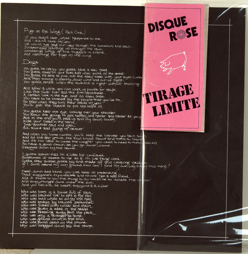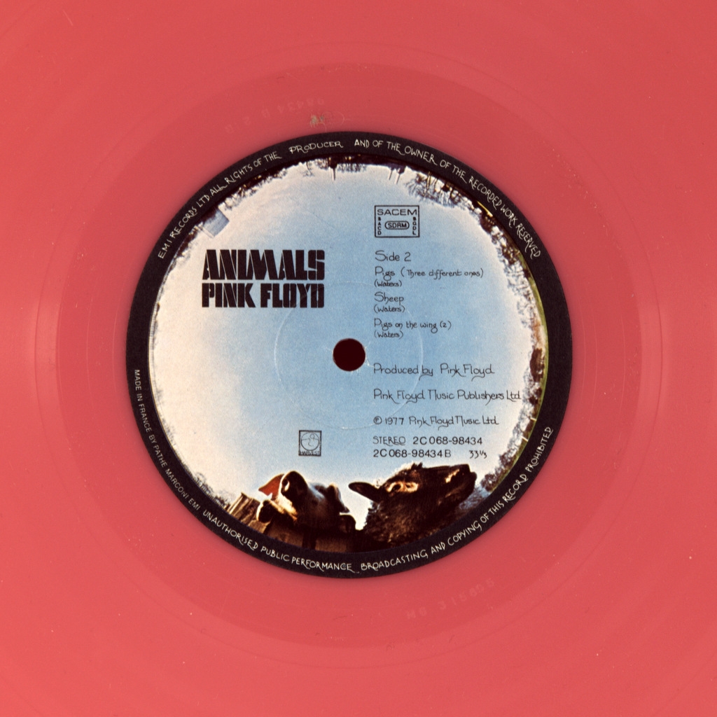 PINK FLOYD-ANIMALS-1977-FIRST FRANCE PRESS (LIMITED)-HARVEST-2C068-98434Y. Very rare limited edition original pink vinyl is one of the must-have in the collections pagomenos. Animals is the tenth Studio album by British progressive rock band Pink Floyd, released on 23 January 1977. Recorded at Studio "Britannia row" (Britannia Row Studios) (London). Reached second place in the hit parade of great Britain and third in the United States. The original album was released in the UK on 23 January 1977 on the label, Harvest Records, then on Columbia Records in the USA 2 Feb 1977.The album ranks 14th in the list of "top 25 best classical albums of progressive rock" by PopMatters.
