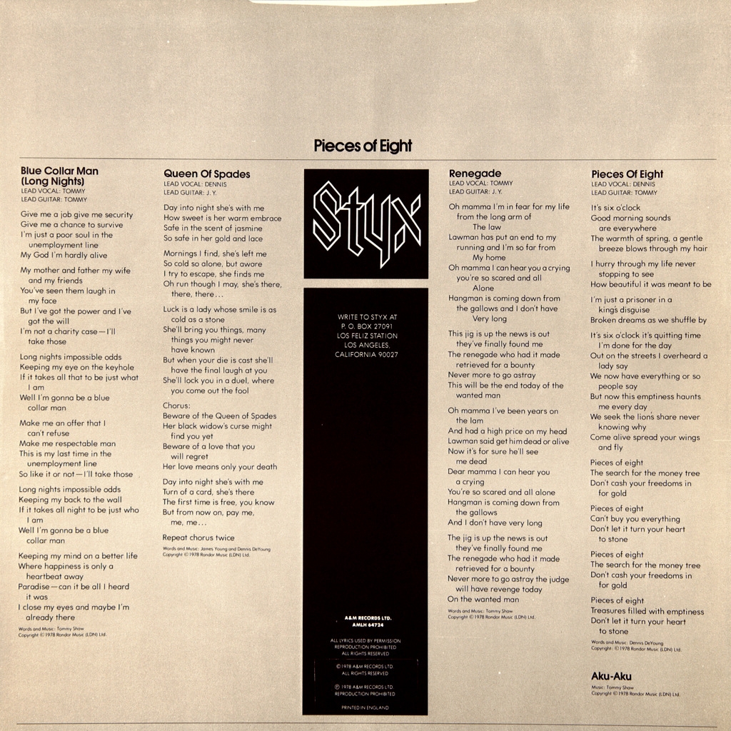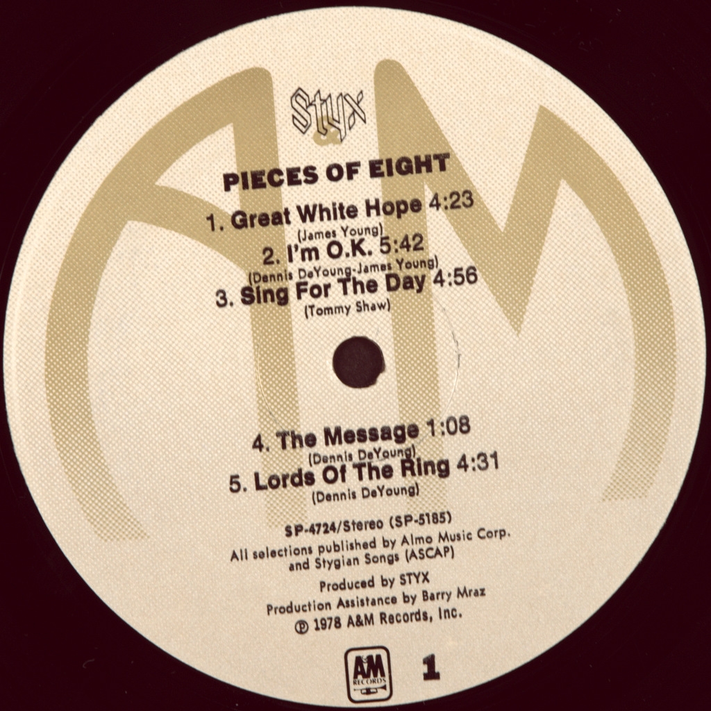STYX-PIECES OF EIGHT-1978-FIRST PRESS USA-A&M-SP-4724. Rare American original. Pieces Of Eight is the eighth Studio album by Styx , released September 1, 1978. The album reached the top # 6 in the Billboard album chart, and like its predecessor, would be triple platinum.