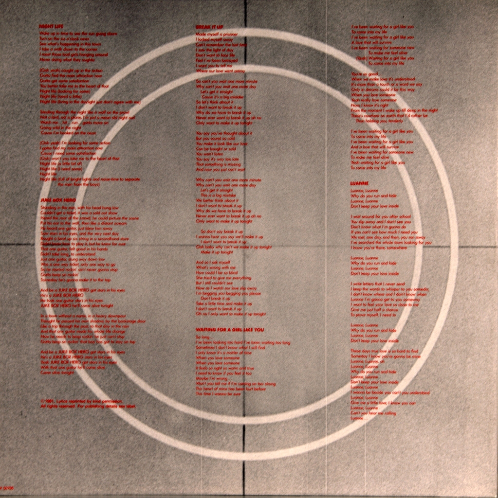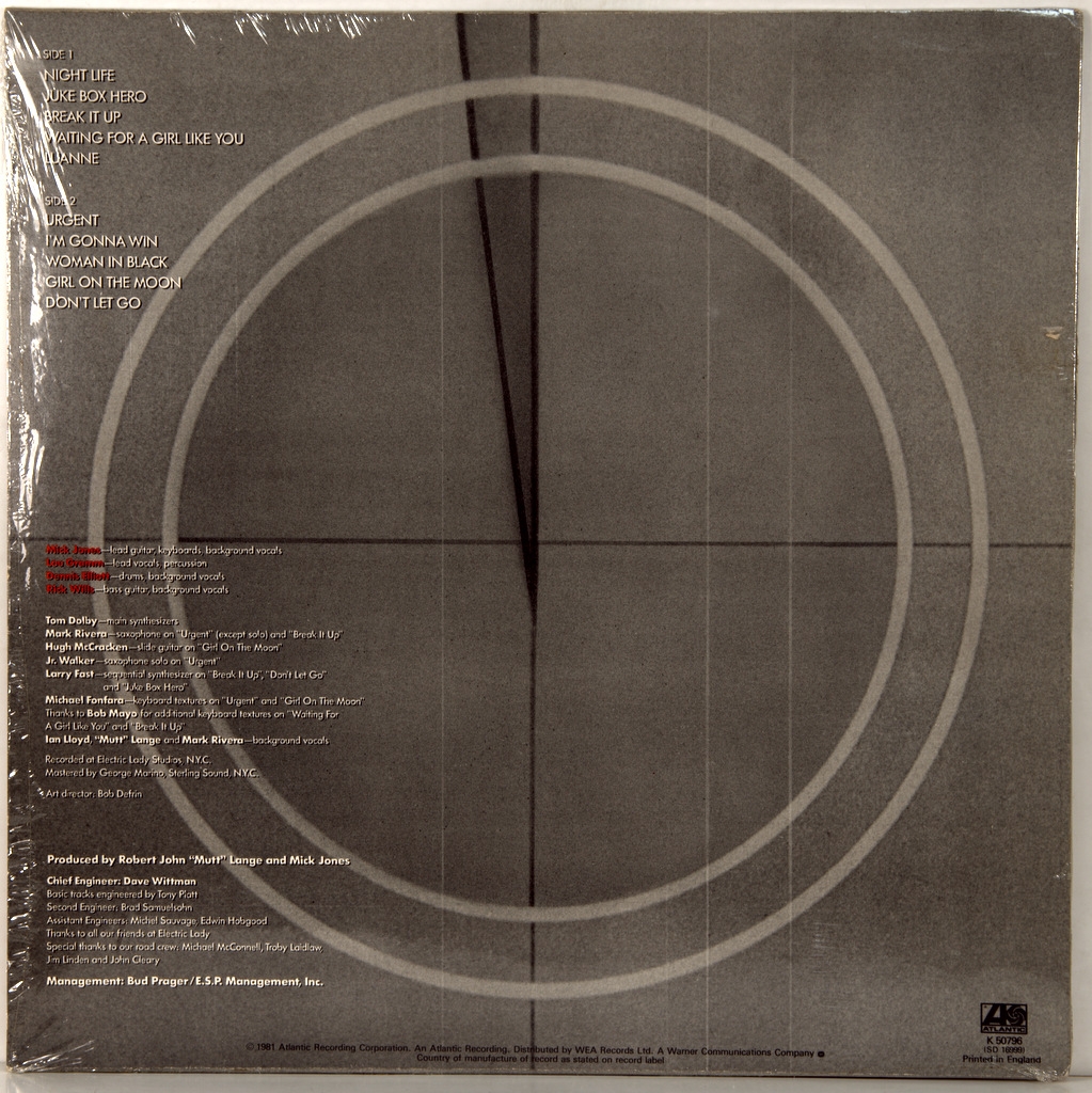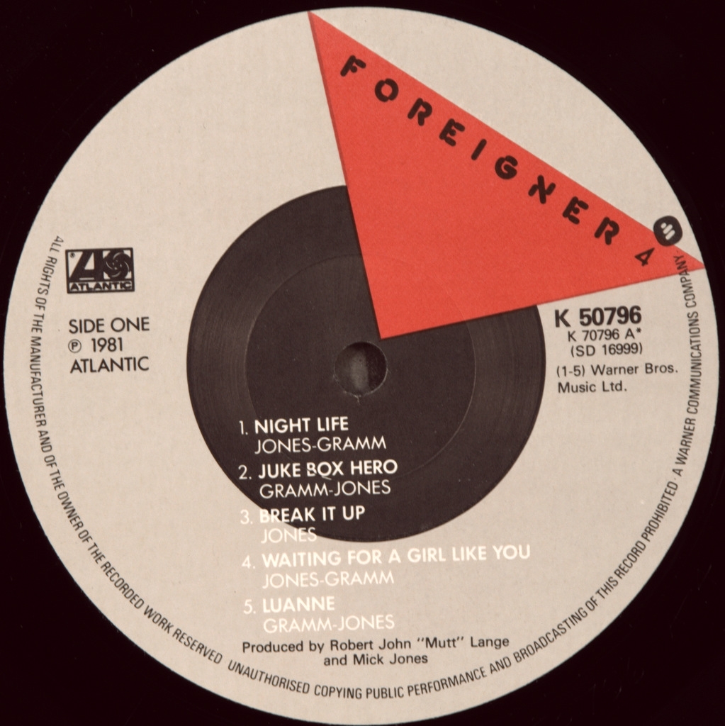 FOREIGNER-4-1981-first press UK-ATLANTIC - K50796.matrix A-4/B. Foreigner 4 is the fourth Studio album by the hard rock band Foreigner, released in 1981 by Atlantic Records. The songs "Waiting for a Girl Like You", "Urgent" and "Juke Box Hero", released as the album's main singles, became hits. The CD seems to have completed the band's transition to hard rock, started in Head Games. Ian MacDonald, al Greenwood left the band before recording 4, they were not permanently replaced, and the sound of the album changed. As a result, all the songs on the album were written by Lou Gramm and/or Mick Jones. MacDonald and Grievor played saxophone and keyboards, respectively, thus needed musicians who would be able to replace them. Junior Walker's saxophone solo on "Urgent" was probably the best thing on the album. The album was also recorded by a young Thomas Dolby, who later had a successful solo career. "Urgent" was re-released in 1991. Juke Box Hero went gold in the United States, and the single peaked at number 26 on the Billboard 200
