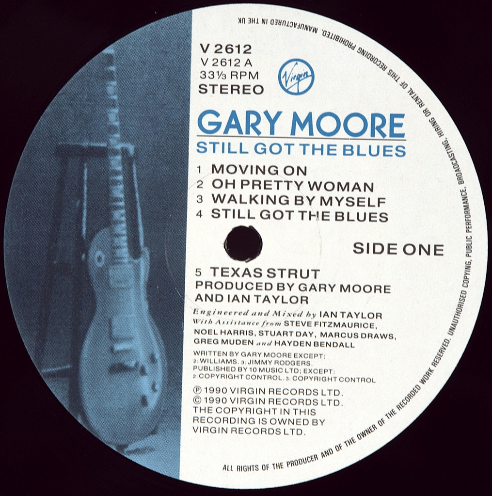 MOORE GARY-STILL GOT THE BLUES-1990-first press UK-VIRGIN-V2612. A rare British original legend in rock music. Still Got the Blues is the eighth Studio album by Northern Irish guitarist and singer Gary Moore, released in 1990. The album marked a significant change in style for Moore, [1][2] who prior to this album was primarily known for his hard rock work with Thin Lizzy, G-Force, Greg lake and during his extensive solo career, as well as his jazz fusion work with Colosseum II. As the name suggests, Still Got The Blues demonstrates Moore's commitment to electric Blues. The title track was released as a single and reached # 97 on the Billboard Hot 100 on February 16, 1991. [4] To date, it is Moore's only single to chart on this chart. on February 16, 1991, the album peaked at number 83 on the Billboard 200, and was certified gold by the RIAA in November 1995. It was Gary Moore's most successful album in both sales and chart positions in the United States.