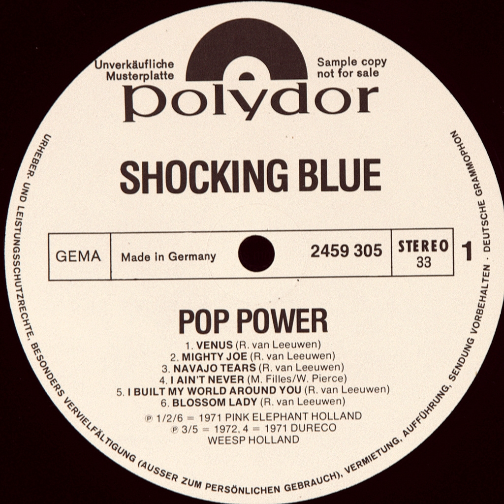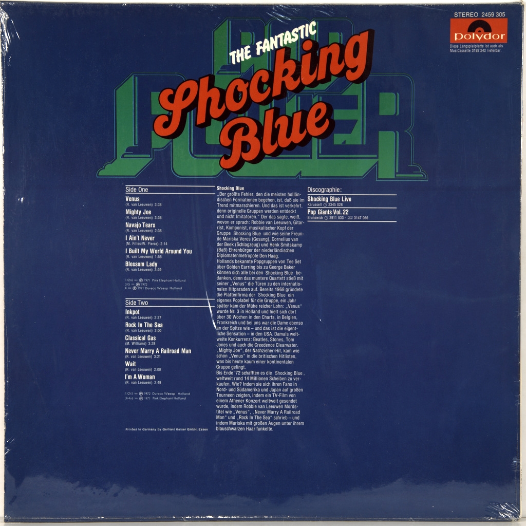SHOCKING BLUE-POP POWER-1972-FIRST PRESS (PROMO) GERMANY-POLYDOR-2459305. A very rare promo original compilation of hits for the entire period of the Dutch super group, released with an alternative cover in Germany.