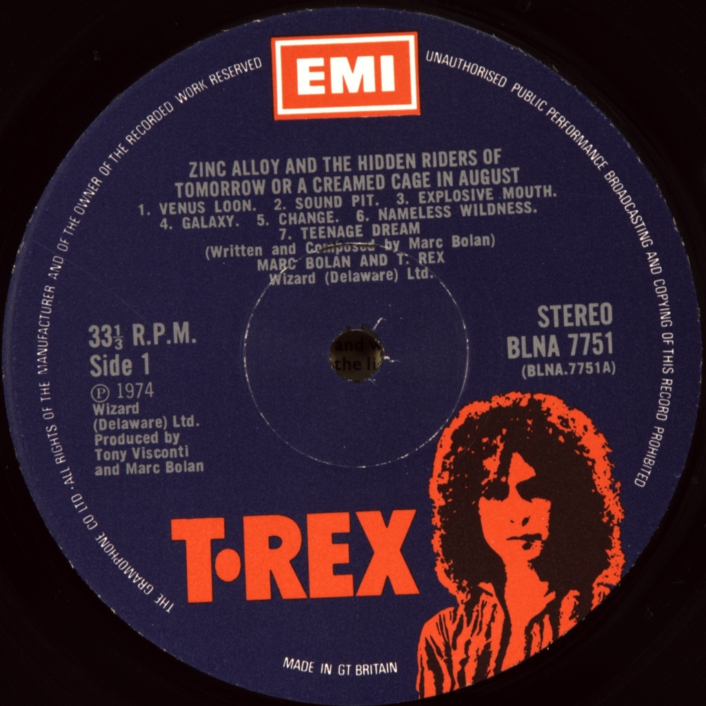 T.REX-ZINC ALLOY.......-1974-FIRST PRESS UK-EMI - BLNA7751. A rare British original of the cult glam rocker . Zinc Alloy and The Hidden Riders of Tomorrow (subtitled A Creamed Cage in August) is a 1974 Album by Marc Bolan's band T. Rex, the ninth since debuting as a Tyrannosaurus Rex in 1968 .It was released on February 1 on the T. Rex record label, distributed by EMI. This was the first and only album to be credited to "Marc Bolan and T. Rex".Unlike previous T. Rex albums, it was not released in the United States.