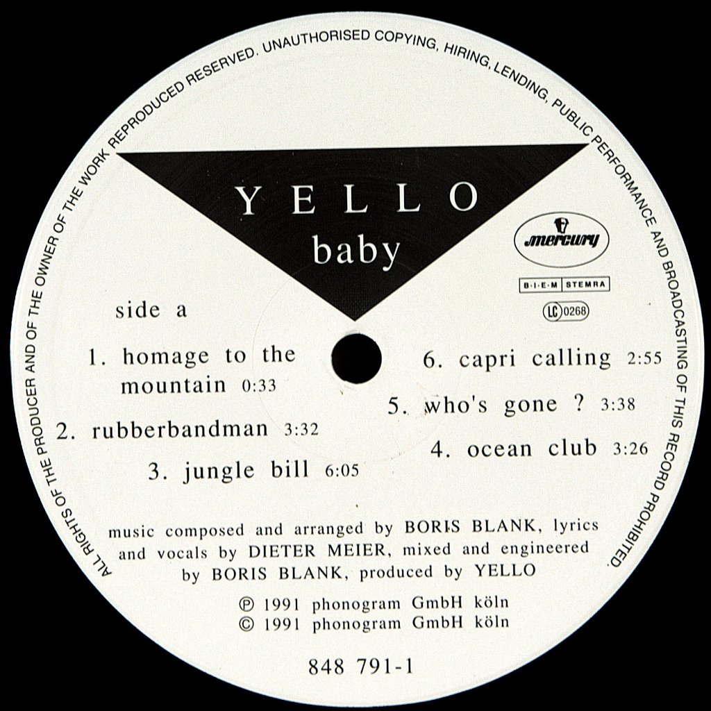 YELLO-BABY-1991-FIRST PRESS GERMANY -MERCURY-848791-1. Very rare original cult album of the famous band. Baby is the seventh Studio album by Yello, released in 1991 under the label Mercury. The album took first place in chat first in Austria and 5 in Switzerland.