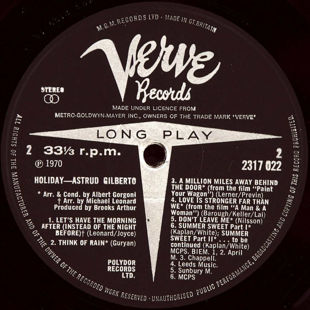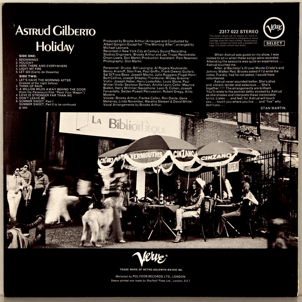 ASTRUD GILBERTO HOLIDAY-1970-ORIGINAL PRESS 1971 UK-VERVE-2317022 Rare promo edition of one of the most significant in the discography of the jazz singer. ASTRUD is from Brazil, born on March 30, 1940 in Salvador da Bahia, Brazil. She became famous in the early 1960s for recording the Bossa Nova hit "The Girl from Ipanema", performing with Stan Getz and Joao Gilberto (to whom she was married).