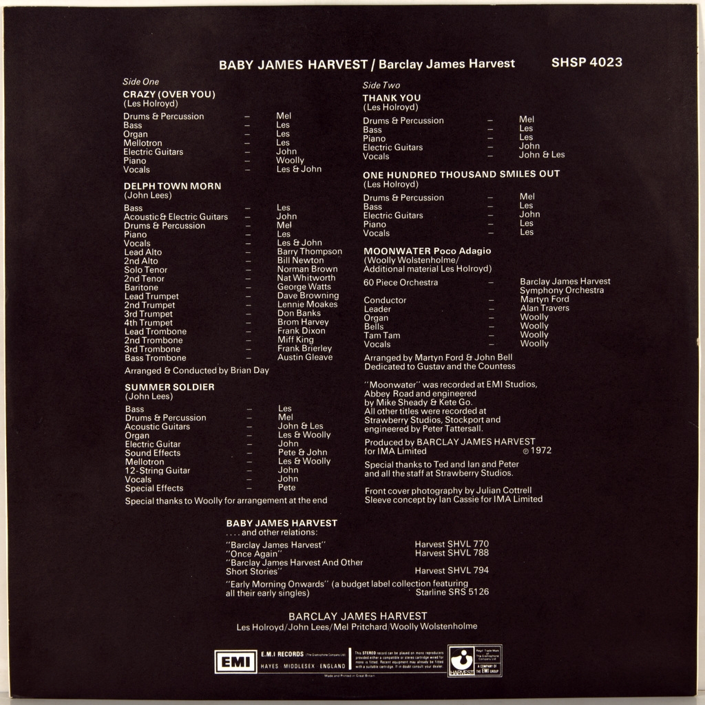 BARCLAY JAMES HARVEST-BABY JAMES HARVEST-1972-FIRST PRESS UK-HARVEST-SHSP4023. Matrix A-1/B-1, Stamper 1G/1G (Dream!) A rare British original of the cult prog band. Baby James Harvest is the fourth album in the discography of British rock band Barclay James Harvest, the last on Harvest Records. It was released on November 10, 1972. The album is fixed on the high positions of the charts. And at this high position, the band moves to POLYDOR, building on their success with each subsequent album. The album turned out to be complex , Mature and very advanced conceptual, due to the diversity of musical genres.