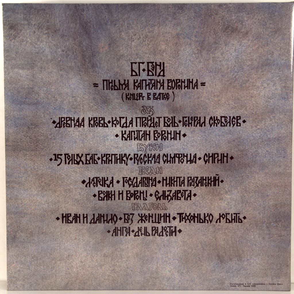 BG (AQUARIUM) - LETTERS OF CAPTAIN VORONIN-1993-FIRST PRESS RUSSIA-FEELEE-FL008/009. Very rare original single edition on vinyl. Letters of captain Voronin is a live album by Boris Grebenshchikov and the BG Band. Almost all the songs were recorded at a concert (or maybe at concerts, since there were three of them) in Kirov in October 1991, except for the song "day of joy", which was recorded in the Studio at Fontanka 39 in June 1991.Many songs from this live album were played by Grebenshchikov together with the old composition of "Aquarium". Theoretically, they should have been included in the never-recorded 1988 album "Amazing deeds of Captain Voronin". As a result, almost all of them ended up in different versions on separate collections: "When the pain passes" and "15 naked women" - in the anthology " history of the Aquarium. Archive. Volume III", "Captain Voronin" — on the soundtrack to the film" Black rose — the emblem of sadness, red rose — the emblem of love"," Ivan and Danilo "and" angel "— on the album" Feudalism"," Without women "and" Quietly love "- on the album BG"Songs of Alexander Vertinsky".