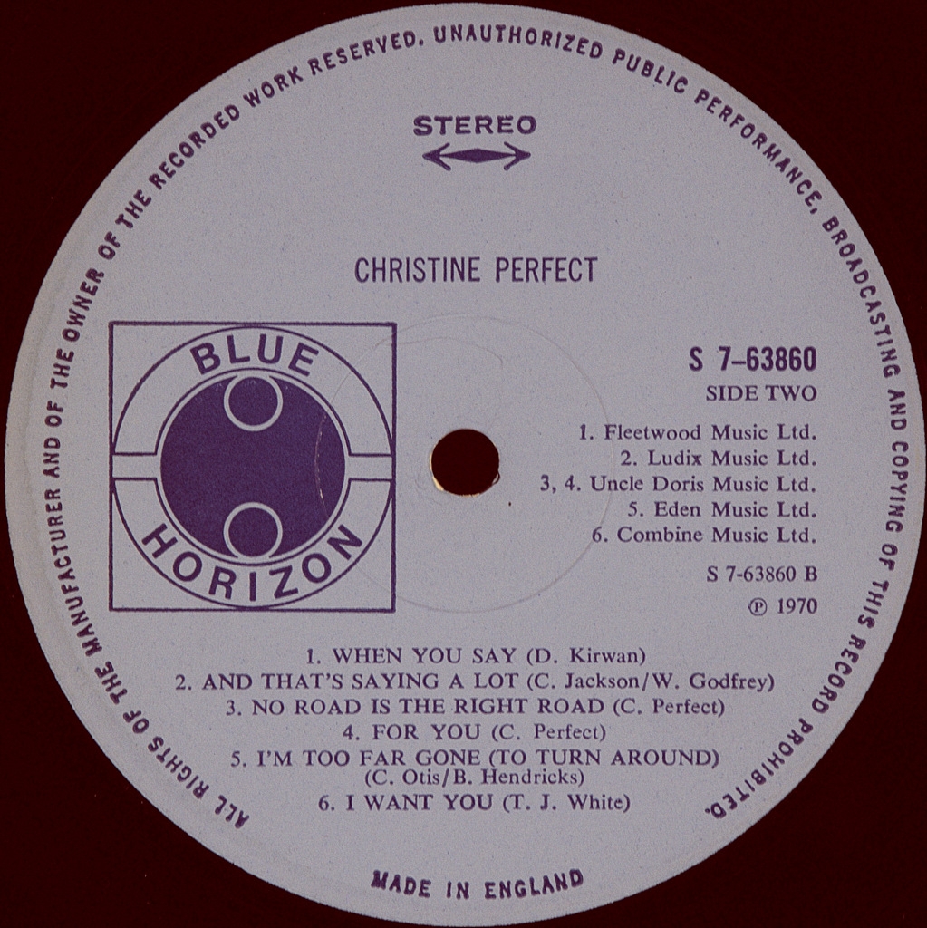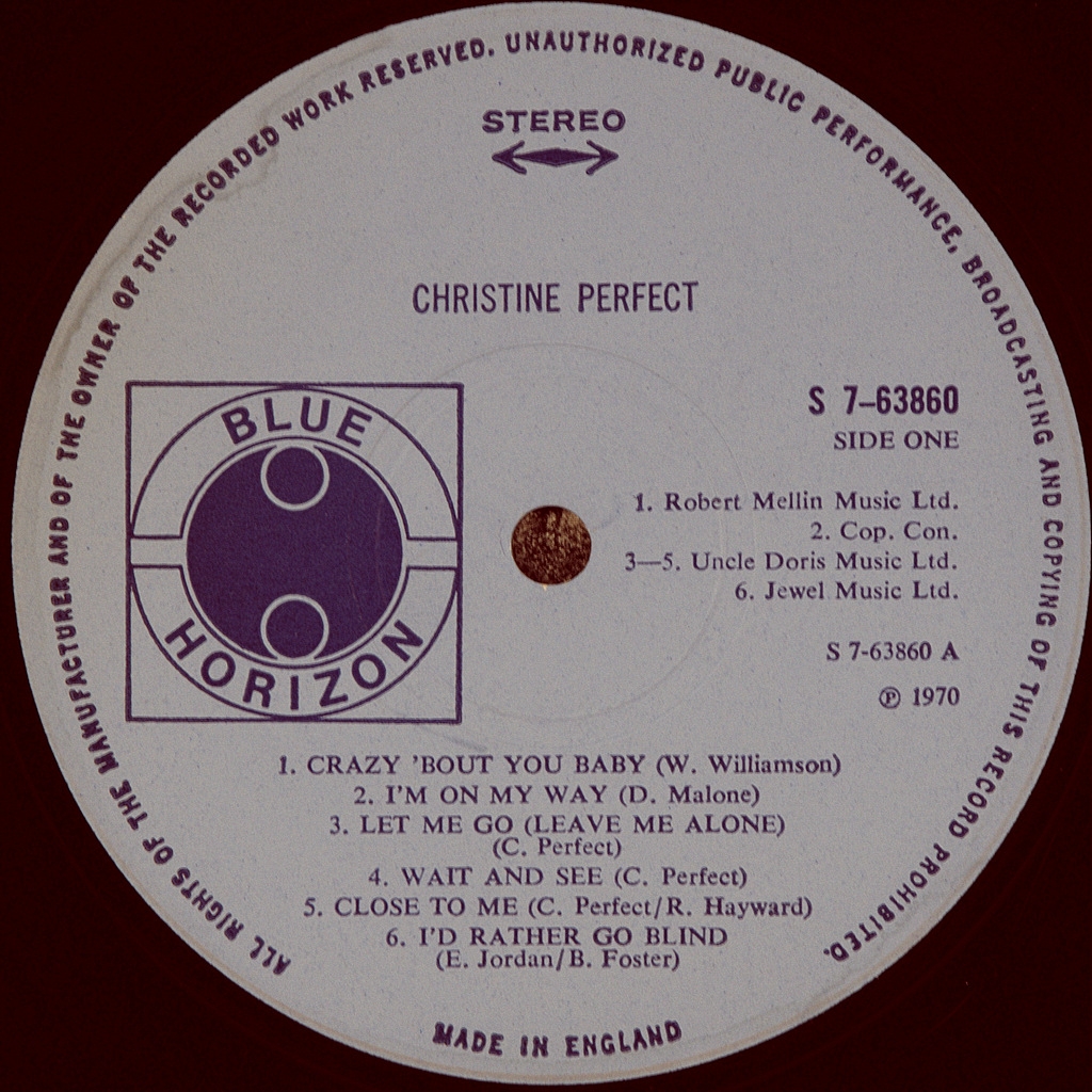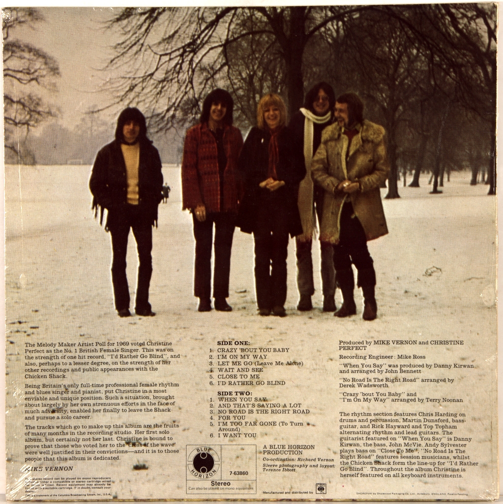 CHRISTINE PERFECT-SAME-1970-FIRST PRESS UK-BLUE HORIZON-S7-63860. Of The Matrix A-1/B-1. A very rare British original by iconic Blues rockers FLEETWOOD MAC and CHICKEN SHACK. Christine Perfect is the self-titled debut solo album by former Chicken Shack keyboardist and singer Christina perfect (later known as Christina McVie). The album was released immediately after Perfect left Chicken Shack, but before she joined Fleetwood Mac. It featured Etta James ' "I'd Rather Go Blind", which was previously a hit single for Chicken Shack. Released in 1970, the album was originally intended to be called "I'm on My Way", as evidenced by copies of the single "I'm Too Far Gone (to Turn Around)". it was re-released in 1976 as the legendary Christine Perfect album.
