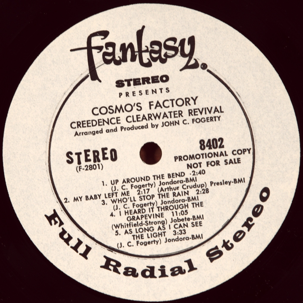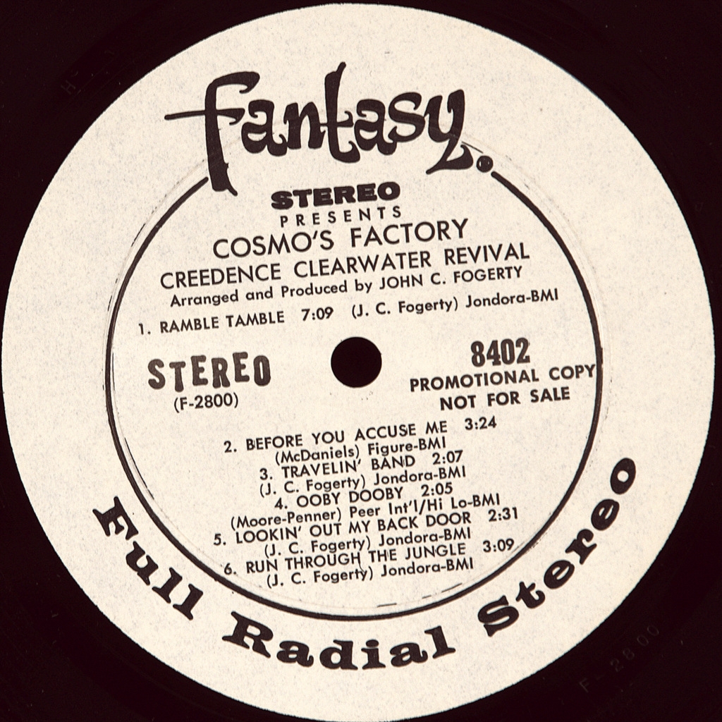 CREEDENCE CLEARWATER REVIVAL-COSMO'S FACTORY-1970-FIRST PRESS (PROMO) USA-FANTASY-F8402 Mega rare promo original of the cult group. Cosmo's Factory is the fifth Studio album by American rock band Creedence Clearwater Revival, released in July 1970 on Fantasy Records. The CD was recorded at Wally Heider's San Francisco Studio. The album was named after the structure where the band set up their work residence, as well as drummer Doug "Cosmo" Clifford, who first named the structure "Factory". Cosmo's Factory became the most commercially successful album of Creedence Clearwater Revival (topping the charts in the US, UK, and Australia) and marked (according to many rock critics) the peak of the band's creativity[1]. Singles from it included "Lookin' Out My Back Door" (#2 US, #20 UK), "Travelin ' Band" (#2 US, #8 UK), "Up Around the Bend" (#4 US, #3 UK)