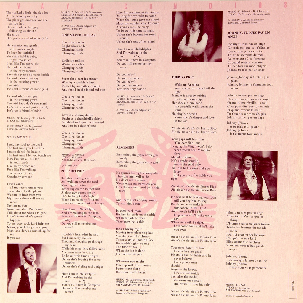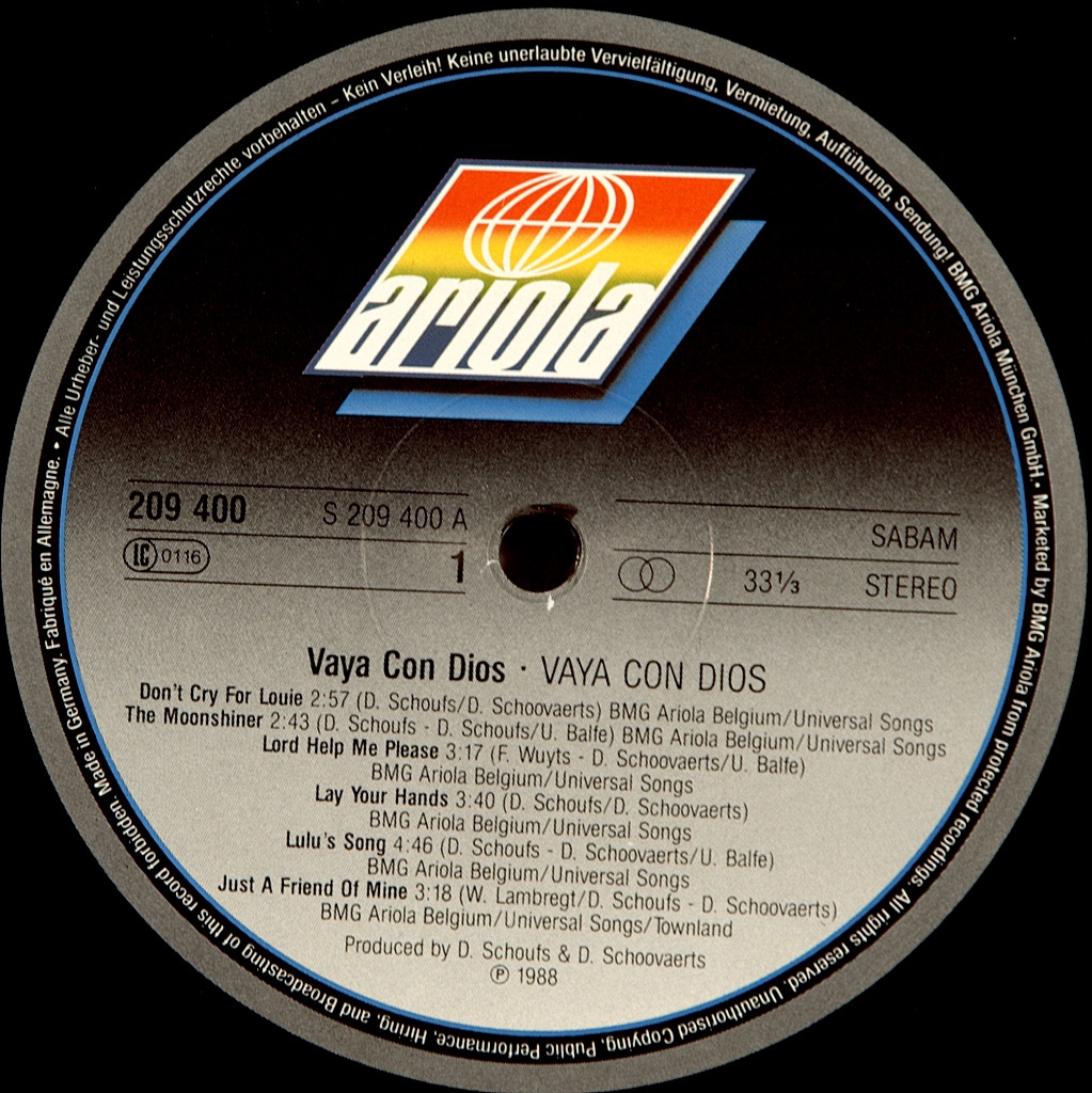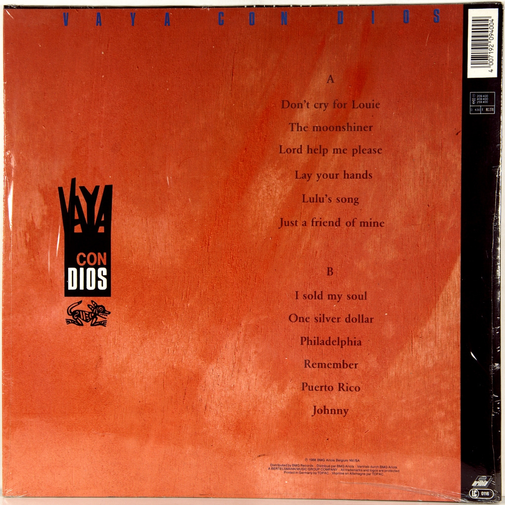 VAYA CON DIOS-SAME-1988-FIRST PRESS UK/EU-ARIOLA-92094004 Rare original popular rock group. Vaya Con Dios is the debut album by Belgian Blues-rock band Vaya Con Dios released on Ariola Records in October 1988. The singles from the album were the songs "Just a Friend of Mine", "Puerto Rico", "Don't Cry for Louie" and "Johnny", the only song in French on the record. Vaya Con Dios was written with the cooperation of various artists, one of them — Burt Dekort, a former member of staff of the Mistress, worked to create "Puerto Rico". The singles "Puerto Rico", "Just a Friend of Mine", "Don't Cry for Louie" has brought fame to the group. After the success of the singles from the album Vaya Con Dios team opened the way to many hit-parades of Europe. The album got platinum status in Finland and gold in thirty countries around the world.