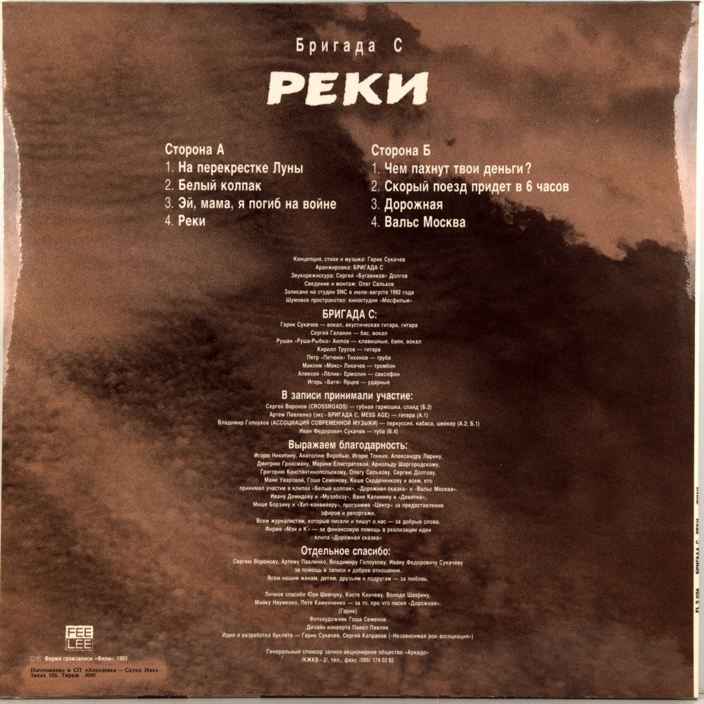 C - RIVER BRIGADE-1993-FIRST PRESS RUSSIA-FEE LEE-FL3024. A rare original of the cult album. In the summer of 1992, the band recorded the album "Rivers". However, in parallel, the participants were preparing a large-scale action "All this is rock and roll" with the participation of Russian rock stars, so the new work of the musicians was sold only in the spring of 1993. The concert presentation of the album "Rivers" was held in the legendary Gorbunov Recreation Center. "Brigade C" presented its CD for three days — on April 28, 29 and 30. Shortly after this event, the band officially ceased to exist, and Garik Sukachev announced the creation of a new project — "Untouchables". The album was released by FeeLee. The record was released on vinyl records in an edition of 5,000 copies.Relative to the previous works of the band, even with the traditional "brigadovsky" drive, the album "Rivers" came out somewhat tired, calm and beautiful, its songs-piercing and dramatic. In its own way, it was a farewell to the old time and the old team. A characteristic feature of the album is also the noise space between the compositions, provided by the tone studio of the Mosfilm film company and consisting of various sounds of wildlife. Most of the submitted songs are still being rotated on radio stations.