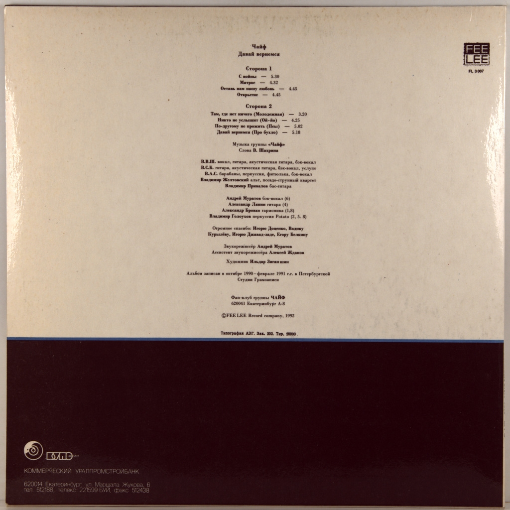 CHAIF-LET'S GO BACK-1992-FIRST PRESS RUSSIA-FEELEE-FL 3 007. A rare original of the cult Russian blues-rock band. "Let's Go Back" is the seventh studio album by the band "Chaif". The album was recorded in October 1990-February 1991 in the St. Petersburg Recording Studio. Released by FEELEE Records in 1992.