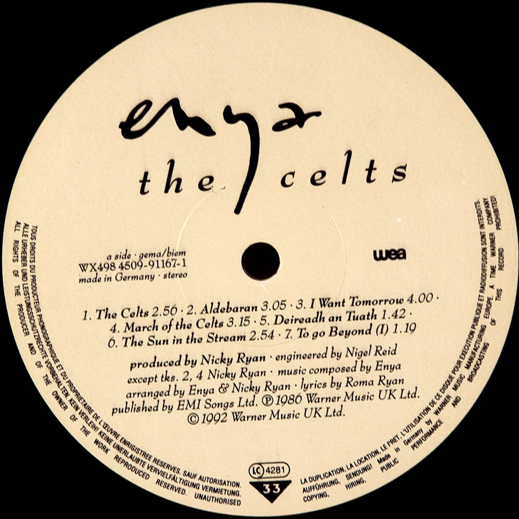 ENYA-THE CELTS-1992-FIRST PRESS UK/EU-GERMANY-WARNER-WX498/4509-91167-1. A rare original of the iconic singer from Ireland. "The Celts" is a song from her 1987 album Enya. It originally served as the B-side to the single "I Want Tomorrow", released in 1987. When the album was re-released in 1992 and renamed The Celts, the title track was released as an accompanying single, peaking at number 29 in the UK.]