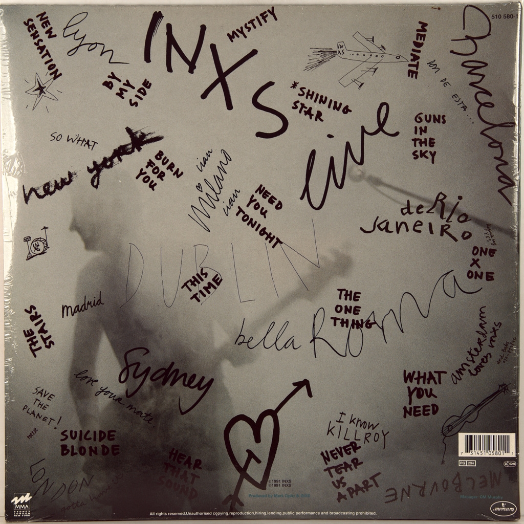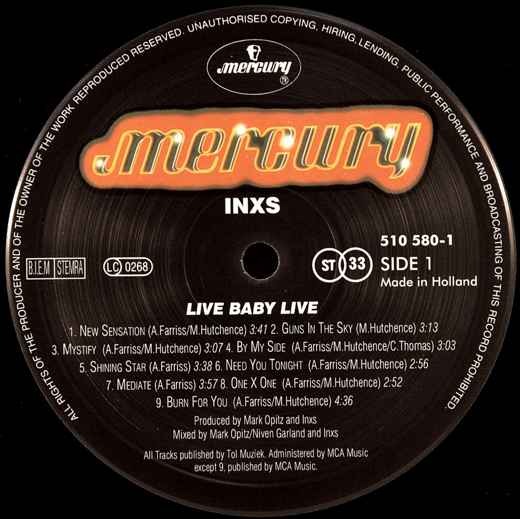 INXS-LIVE BABY LIVE-1991-FIRST PRESS EU-HOLLAND-MERCURY-510580-1. A rare European original of the cult group.Live Baby Live is a live album by Australian band INXS, released in 1991.Live Baby Live recorded during the tour in support of the album X. The album includes live recordings from performances in Glasgow, Dublin, Las Vegas, London, Montreal, Melbourne, New York, Paris, Rio de Janeiro, Sydney, Chicago and Philadelphia. Simultaneously with the album of the same name, a video recording of a concert at Wembley Stadium on July 13, 1991 was released.Despite the negative reviews from critics, the album was enthusiastically received by fans. The album was certified platinum by the Recording Industry Association of America on January 9, 1998.