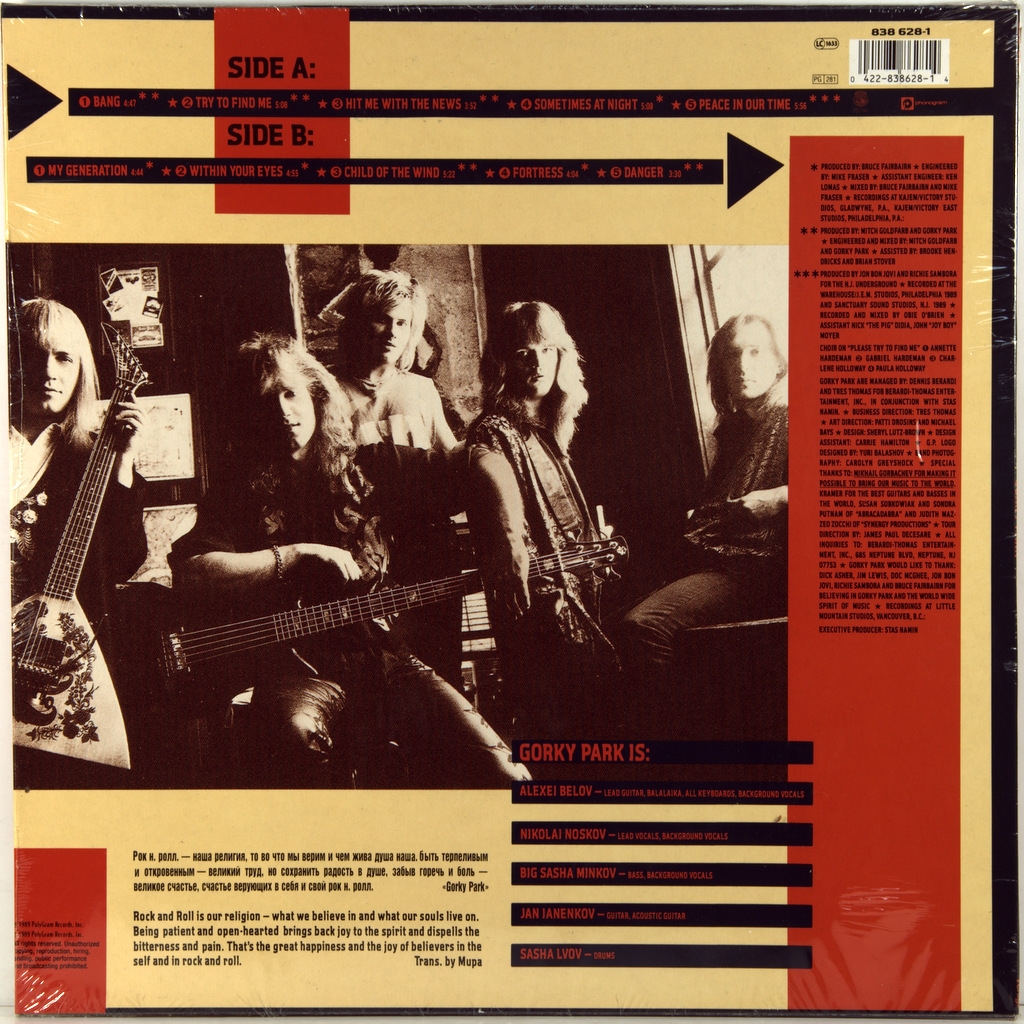 GORKY PARK - GORKY PARK-1989-FIRST PRESS HOLLAND-VERTIGO-838628-1. A rare European original of the cult album. Gorky Park is the debut studio album by Soviet glam metal band Gorky Park. Was released in August 1989. In August 1989, Gorky Park released their self-titled debut album. Music videos for the songs "My Generation" and "Bang"were shot in New York in support of him. The single "Bang" hit the "top 15" on American MTV and lasted there for two months, reaching number 3. The single "Try to Find Me" reached number 81 on the Billboard Hot 100, making Gorky Park the first Russian band to enter the US national chart. The album itself reached number 80 on the Billboard 200, with sales exceeding 300,000 copies in three weeks.