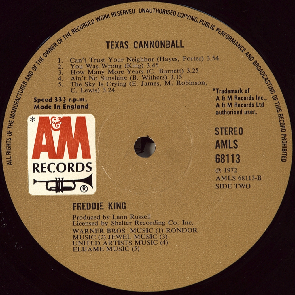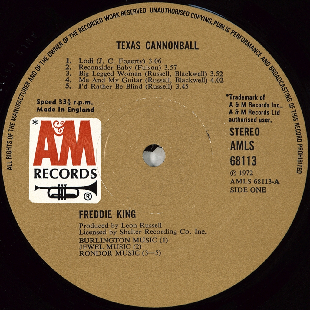 FREDDIE, KING-CANNONBALL-1972-FIRST PRESS UK-AM-AMLS-68113. A very rare British original blues meter. Freddie King (real name Frederick Christian King) (September 3, 1934-December 28, 1976) was an American blues guitarist and singer. He is best known for his recordings of the 1960s, particularly his renditions of such hits as "Hide Away" and "Have You Ever Loved a Woman". Freddie King influenced the English musicians who created blues rock in the 60s.