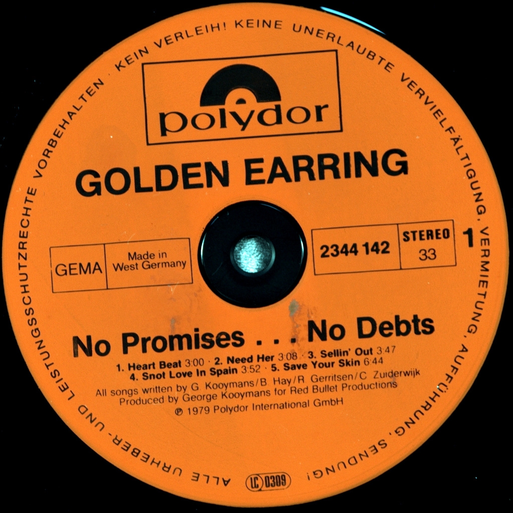 GOLDEN EARRING-NO PROMISES...NO DEBTS-1979-FIRST PRESS GERMANY-POLYDOR-2344142. Matrix A-1/B-1. A rare original of the cult group. No Promises...No Debts is an album by Dutch rock band Golden Earring, released in 1979 in the United States. All songs on the album were written by George Kooymans, Rinus Gerritsen, Barry Hay, and Cesar Zuiderwijk. Allmusic rated the album 3 stars.