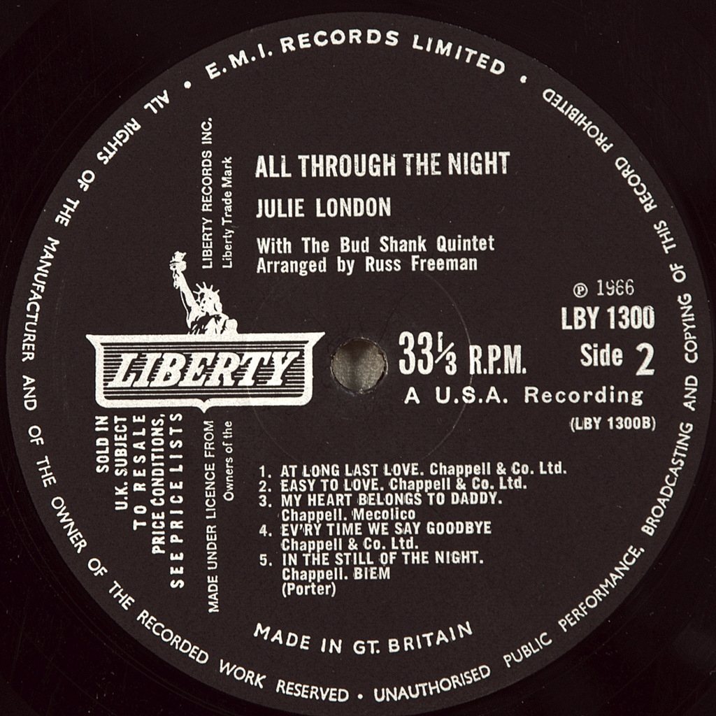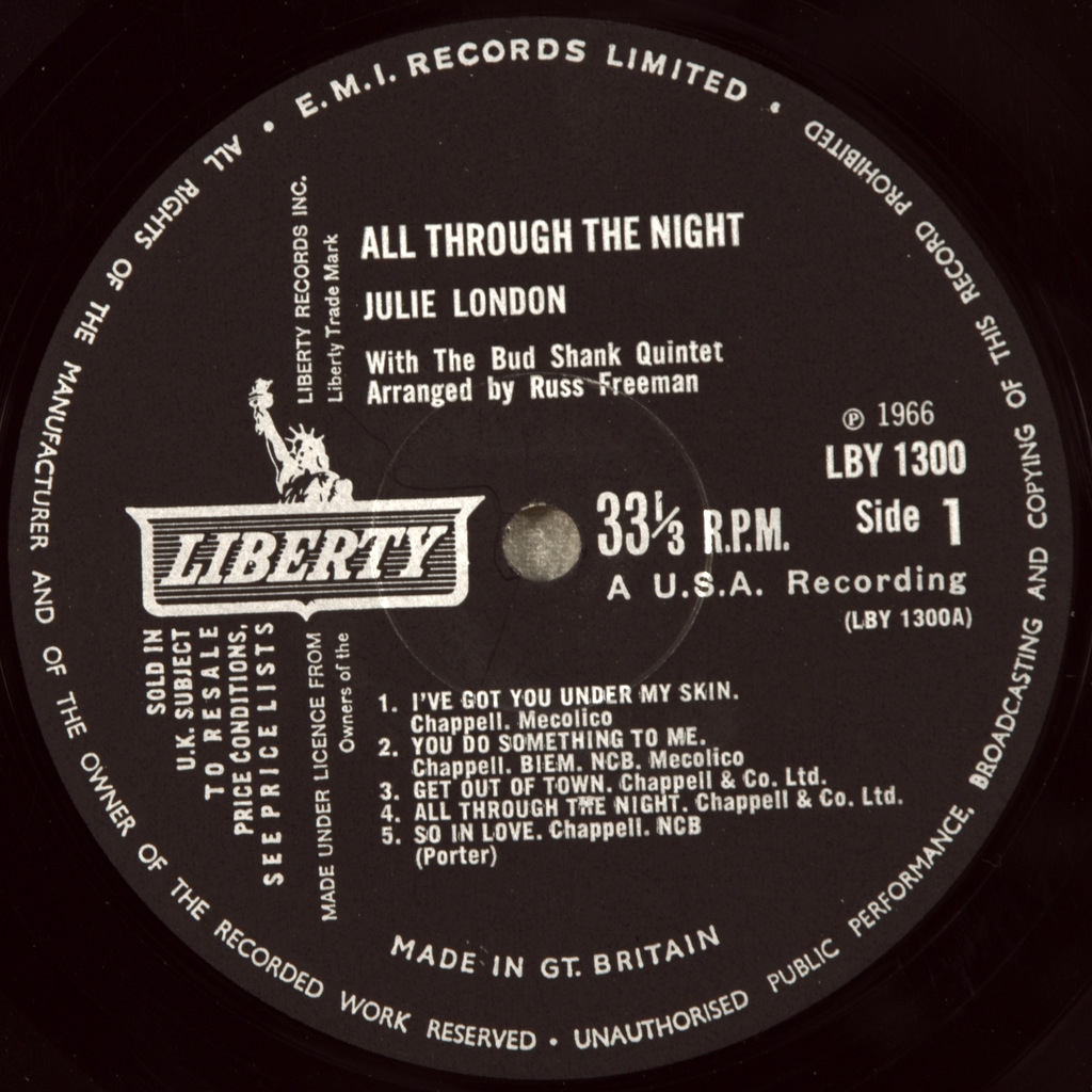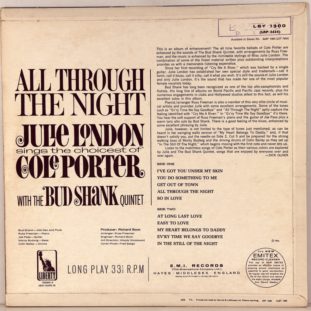 JULIE LONDON - ALL THROUGH THE NIGHT-1966-FIRST PRESS UK-LIBERTY-LBY1300. A very rare British original of the iconic album. All Through the Night: Julie London Sings the Choicest of Cole Porter is an LP album by Julie London, released by Liberty Records. She was accompanied by the Bud Schenk quintet with star musicians.