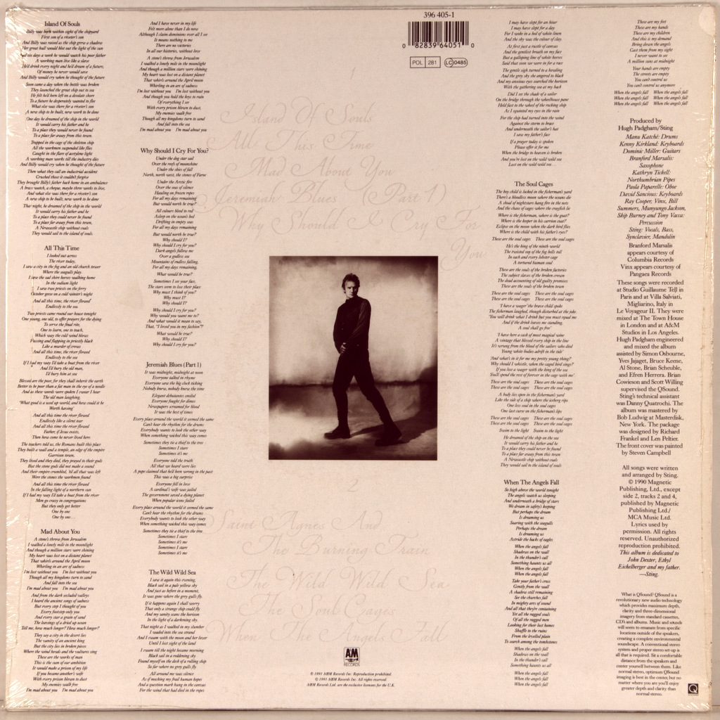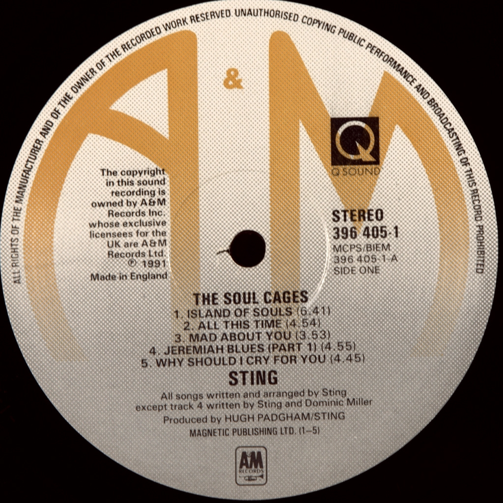 STING-THE SOUL CAGES-1991-FIRST PRESS-UK-AM-396405-1 Very rare British original of the cult album. The Soul Cages is the third studio album by British rock musician Sting, released on 22 January 1991. It became the singer's second album to reach the top of the national chart in his homeland. Four singles were released in support of the album: "All This Time", "Mad About You"," Why Should I Cry For You "and" The Soul Cages", the latter winning a Grammy Award for Best Rock Song in 1992.