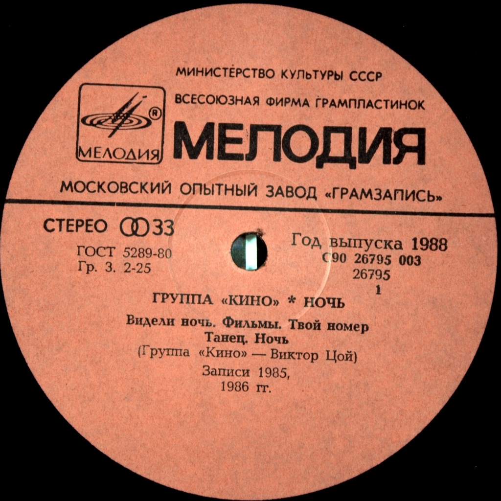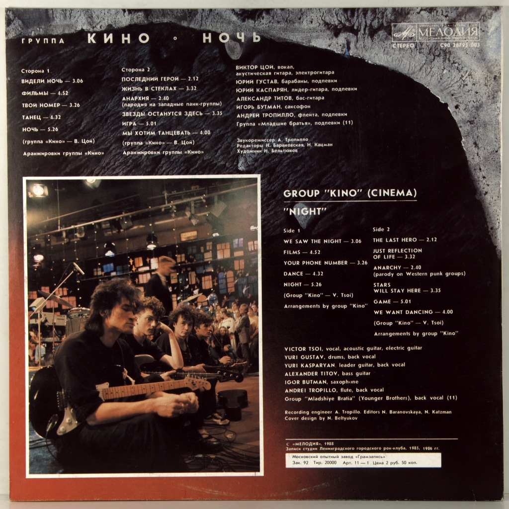 MOVIE- NIGHT-1988-FIRST PRESS USSR-MELODIA-C9026795003. A rare original of the cult album. Night is the fifth studio album by the Soviet rock band Kino, recorded in 1985 and released in January 1986. The album was recorded at the studio "AnTrop". Initially, it was released on compact cassettes, and in 1988 it was released on records by the record company "Melody". It is the band's first officially released album. The album took the 12th place in the list of "50 best Russian albums of all time", compiled by the magazine "Afisha" according to the results of a survey of young Russian musicians.