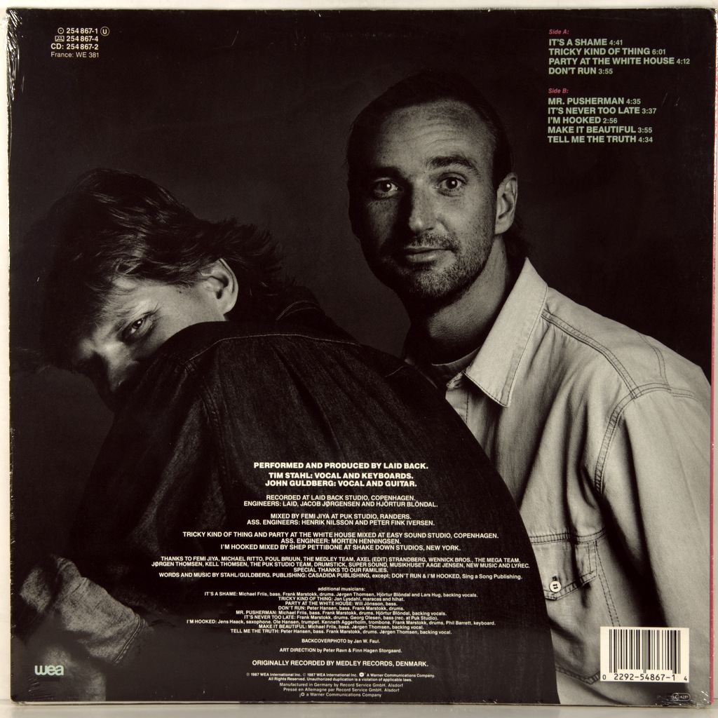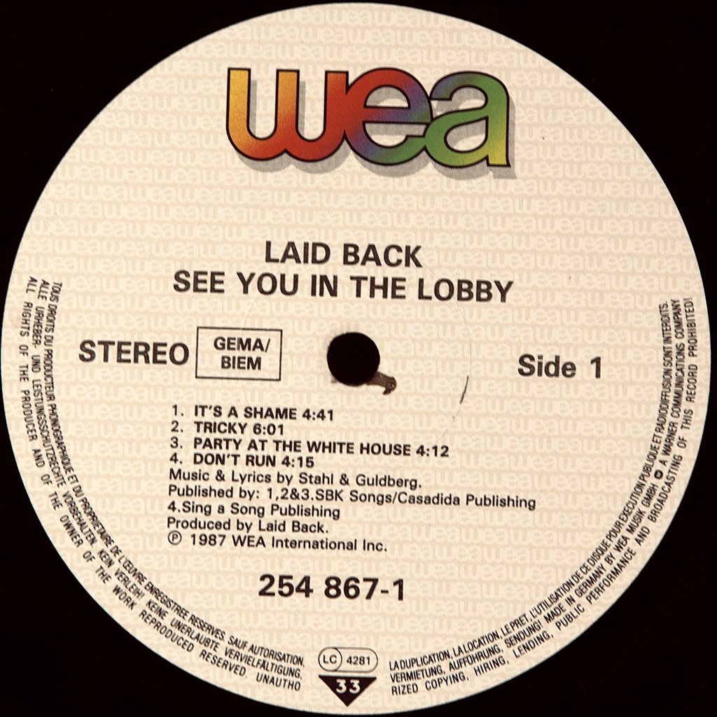 LAID BACK-SEE YOU IN THE LOBBY-1987-FIRST PRESS GERMANY - WEA-254867-1. A rare original of the cult disco album. The fourth studio album by the Danish pop band Laid Back, released in 1987. The album reached number 123 on The Billboard 200 chart.