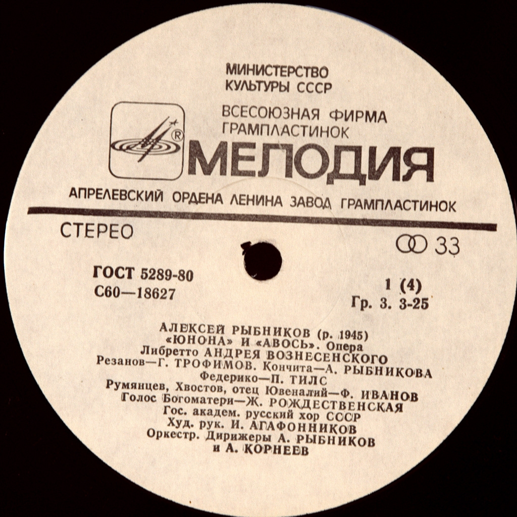 ALEXEY RYBNIKOV-ROCK OPERA JUNO AND AVOS-1980-THE FIRST PRESS OF RUSSIA-MELODIA-C60-18627. "Juno and Avos" is a rock opera by Alexey Rybnikov (music) and Andrey Voznesensky (libretto). The premiere, directed by Mark Zakharov, took place on July 9, 1981 on the stage of the Moscow Lenin Komsomol Theater, where the performance, which has become a kind of business card of Lenkom, took place In parallel with the work on the performance, an audio version of the opera with other performers was recorded in Lenkom in 1980. The first public listening of the recorded work took place on December 9, 1980 in the Church of the Intercession in Fily (Moscow). However, due to censorship obstacles, the album of two stereo records was released by the company" Melody " only in 1982 (number C60 18627-30 (2LP)).
