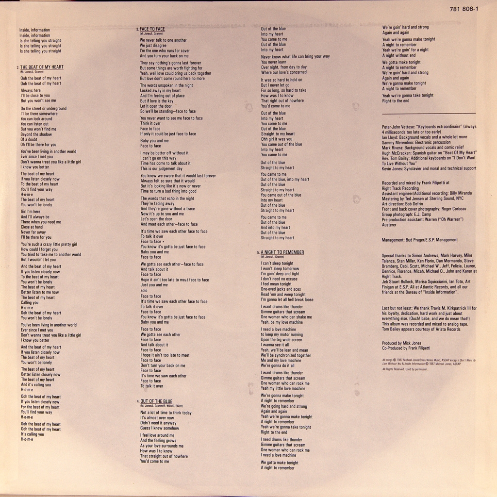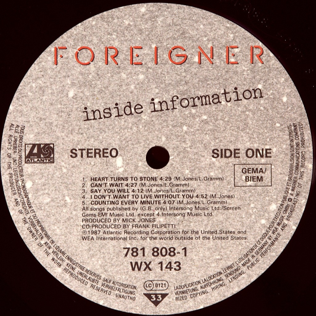 FOREIGNER-INSIDE INFORMATION-1987-FIRST PRESS UK/EU GERMANY-ATLANTIC--781808-1 Rare original of the cult album. Inside Information is the sixth studio album by the British-American rock band Foreigner, released on December 8, 1987. The album debuted at number 15 on the Billboard 200 Albums chart and was certified platinum in the United States with sales of over a million copies. Even though it was a huge standard for any country, the band's sales have certainly plummeted since the release of 4 in 1981. This was the last album to feature the main line-up of the 80s-Gramm, Jones, Wills and Elliot.