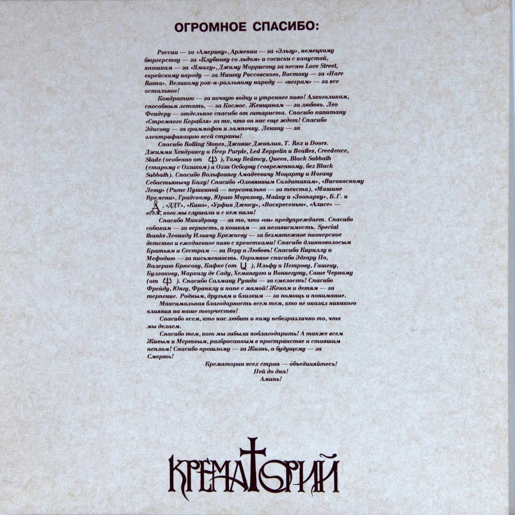 CREMATORIUM-DOUBLE ALBUM (+ POSTER) - 1993-THE FIRST PRESS OF RUSSIA-CREMATORIUM-K1-K4. A rare original of the cult rock-blues-folk band."Double Album" is a collection of the best songs of the Russian rock band "Crematorium", recorded in the period from October 26, 1992 to January 24, 1993 in the tone studio of the Gorky Film Studio and released in 1993 for the 10th anniversary of the group. The music of the album is diverse - waltzes, ballads, rock and roll and blues. The album includes songs from previous albums, re-recorded by the new line-up, and two new compositions. One of the most famous and striking compilation recordings in the band's discography