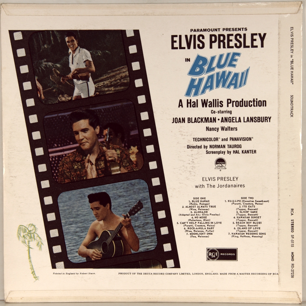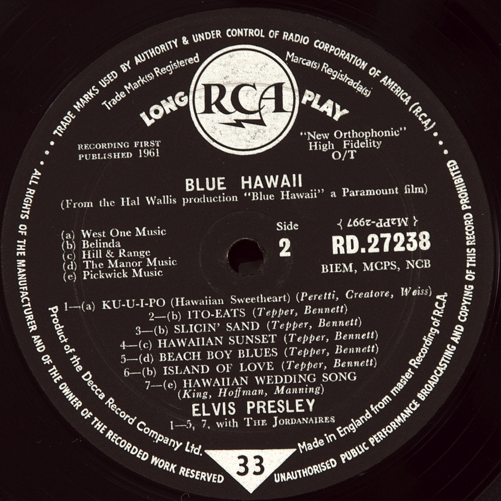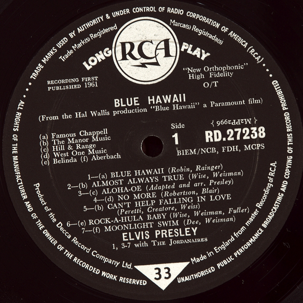 PRESLEY, ELVIS-BLUE HAWAII-1961-THE FIRST PRESS (MONO) UK-RCA-RD-27238. A rare British original of the king of rock and roll. Blue Hawaii is the fourth soundtrack album by American singer Elvis Presley, released on RCA Victor Records in mono and stereo, LPM/LSP 2426, October 20, 1961 . In the United States, the album spent 20 weeks at number one and 39 weeks in the Top 10 of the Billboard Top Pop LPs chart. It was certified Gold on December 21, 1961, Platinum and 2x Platinum on March 27, 1992 and 3x Platinum on July 30, 2002 by the Recording Industry Association of America. second only to the West Side Story soundtrack as the most successful soundtrack album of the 1960s.