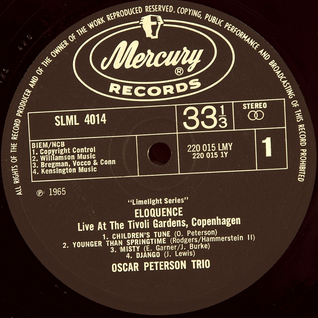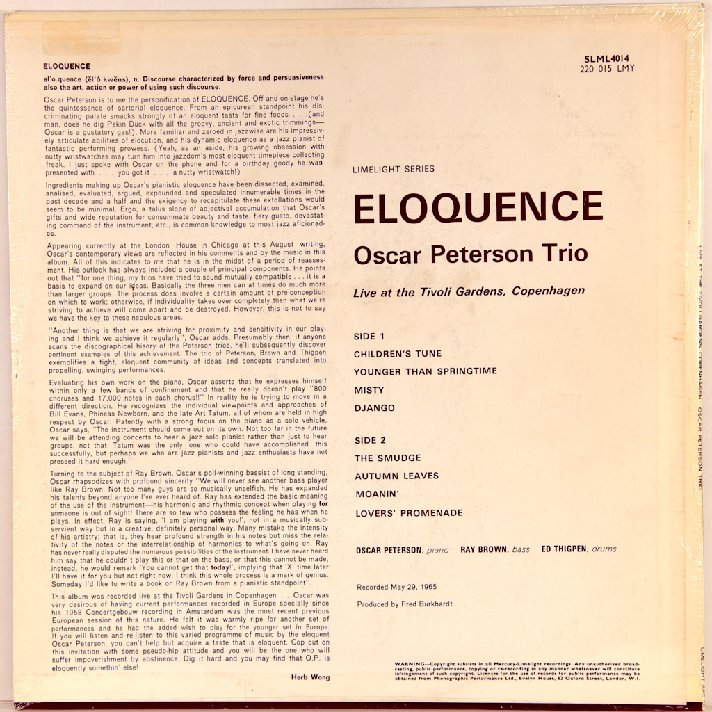 OSCAR PETERSON TRIO-ELOQUENCE (LIVE AT THE TIVOLI GARDENS, COPENHAGEN) - 1965-FIRST PRESS UK-MERCURY-SLML-4014. A rare original of the cult album.Eloquence is a live album by jazz pianist Oscar Peterson and his trio, released in 1965. Eloquence was the last album of the Oscar Peterson trio with drummer Ed Thigpen. Writing for AllMusic, critic Scott Yanow wrote: "The music heard during this "live from Copenhagen" concert is excellent... Peterson is in particularly strong form in "Misty", "Django", the songs "Autumn Leaves" and "Moaning"