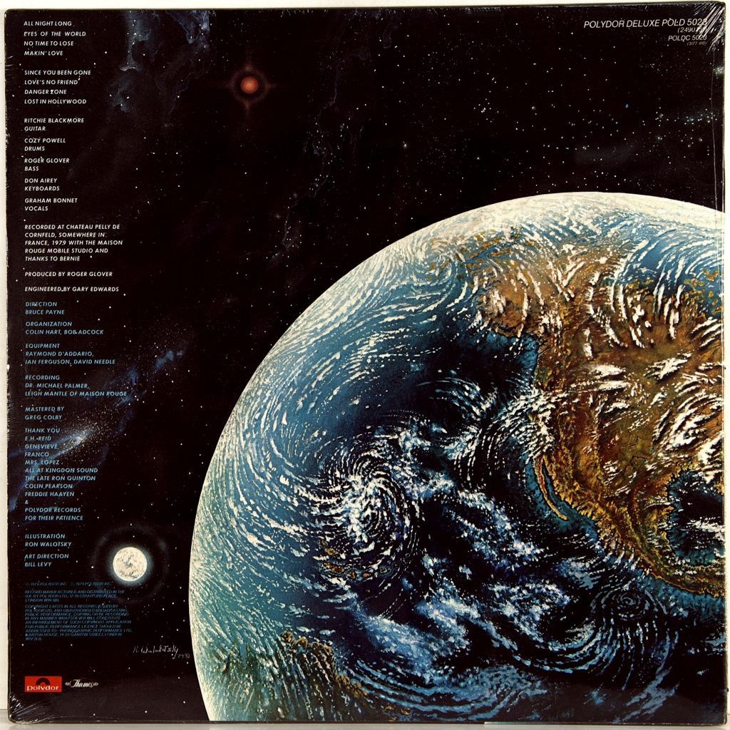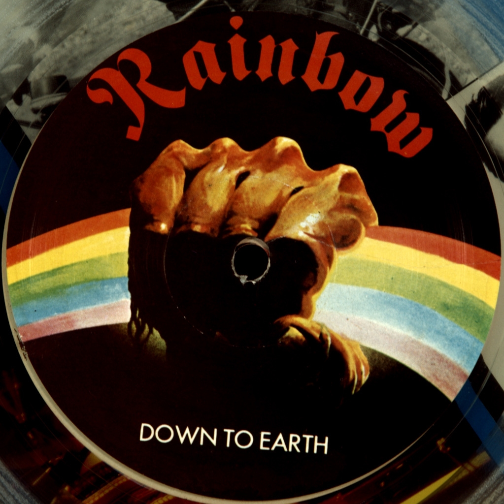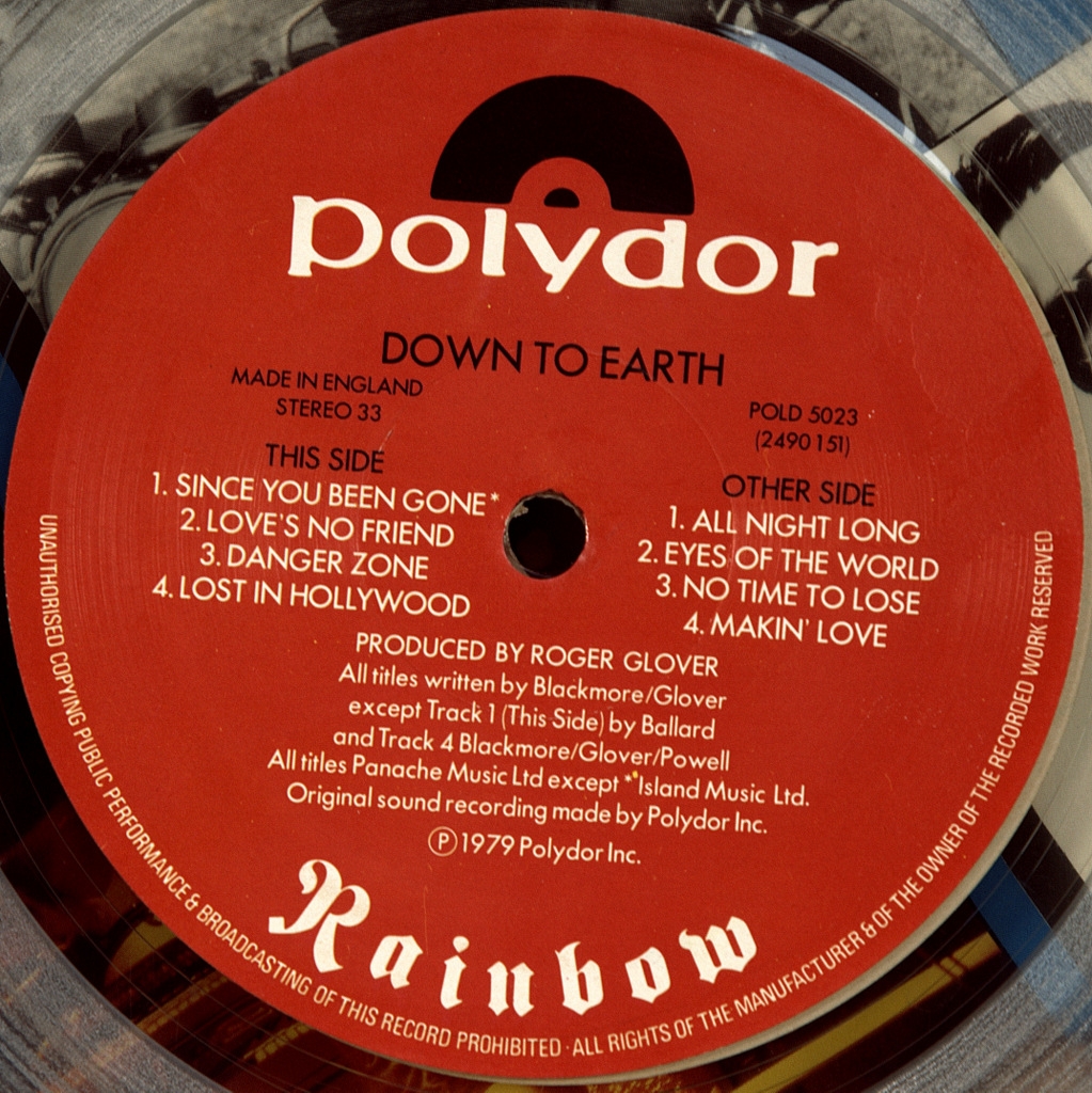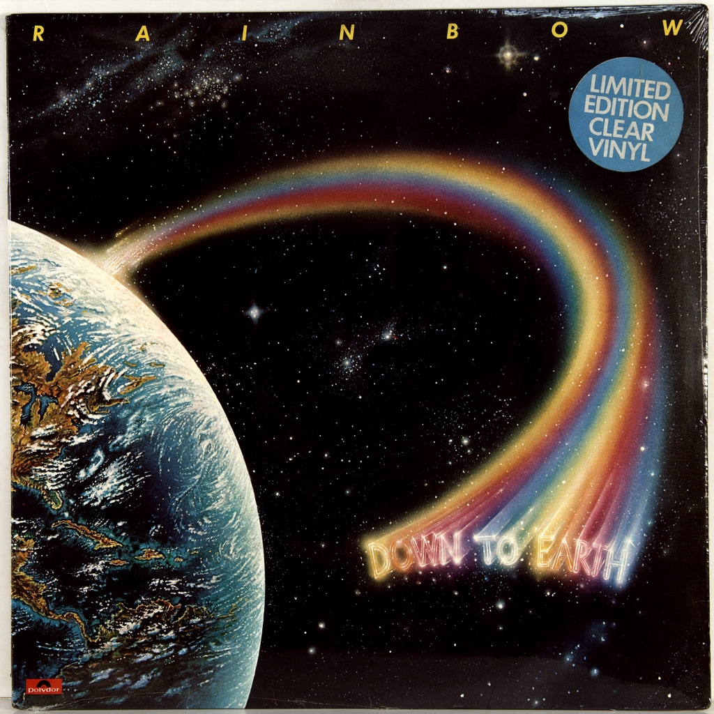 RAINBOW-DOWN TO EARTH-1979-FIRST PRESS UK-POLYDOR-POLD5023. Matrices A-5/B-5. A rare British limited edition original of the cult album. Down to Earth is the fourth studio album by the British hard rock band Rainbow. This is their last album with drummer Cozy Powell and the only album with vocalist Graham Bonnet. Released in 1979, it contains Rainbow's first hit single "Since You've Been Gone", marking the more commercial direction of the band's sound. In 2005, Down to Earth was ranked 431st in the list of the 500 greatest rock and metal albums of all time by Rock Hard Magazine