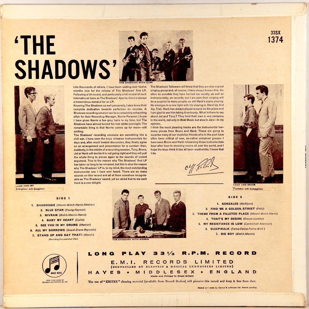 SHADOWS-SHADOWS-1961-FIRST PRESS (MONO) UK-COLUMBIA-33SX1374. A rare British original rock beat band. The Shadows is a 1961 rock album by the British band The Shadows, which reached number one in the UK charts and was recorded at Abbey Road Studios (Studio 2) between 26 October 1960 and 21 June 1961. It was recorded on fully analog equipment in real time, with each track recorded one track per day without any overdubs or edits on a 2-track recording machine. The album had a strong influence on rock music and many famous musicians. For example, Brian May (QUEEN) considers this album the most favorite..