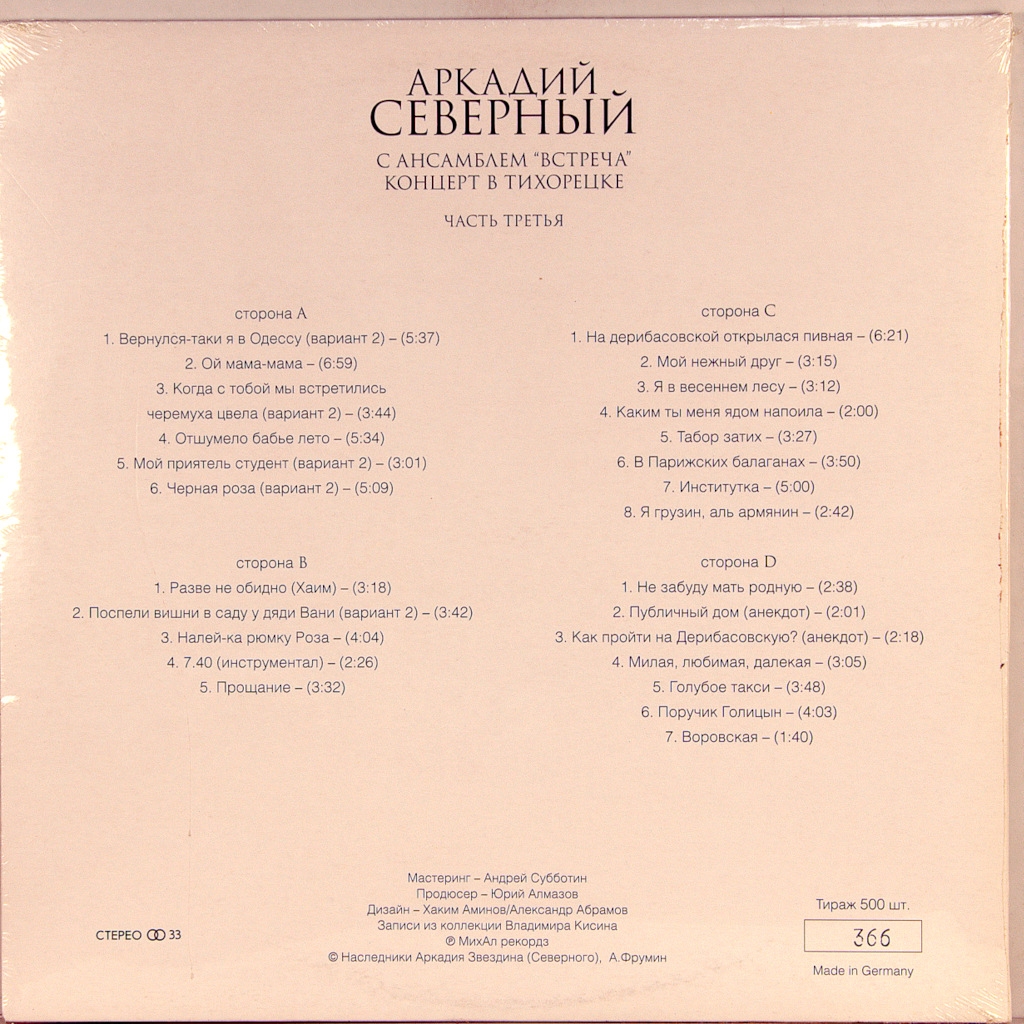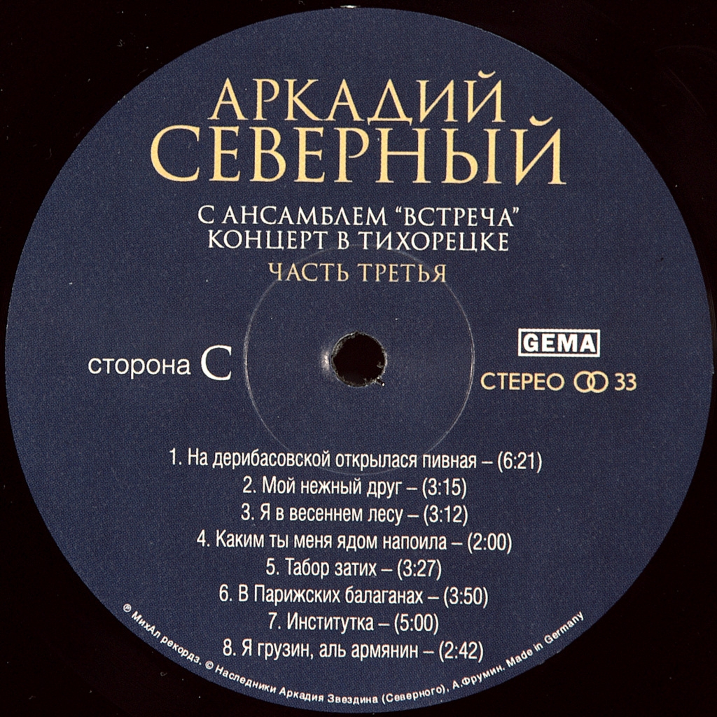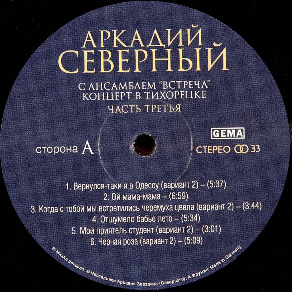ARKADY SEVERNY - CONCERT IN TIKHORETSK (THIRD PART 2LP)-1979-FIRST PRESS 2013 GERMANY -MICHAL RECORDS. A rare limited edition original of the cult concert. Arkady Dmitrievich Severny (real name - Zvezdin; March 12, 1939, Ivanovo - April 12, 1980, Leningrad) was a Soviet musician and singer, performer of songs of modern urban folklore, author's uncensored songs, romances and stylizations. He had an original timbre of voice and an expressive artistic presentation of the song. He could vividly beat a song in any style, from romantic to jazz.