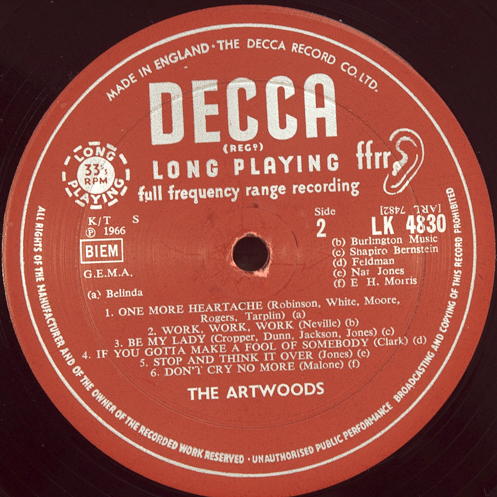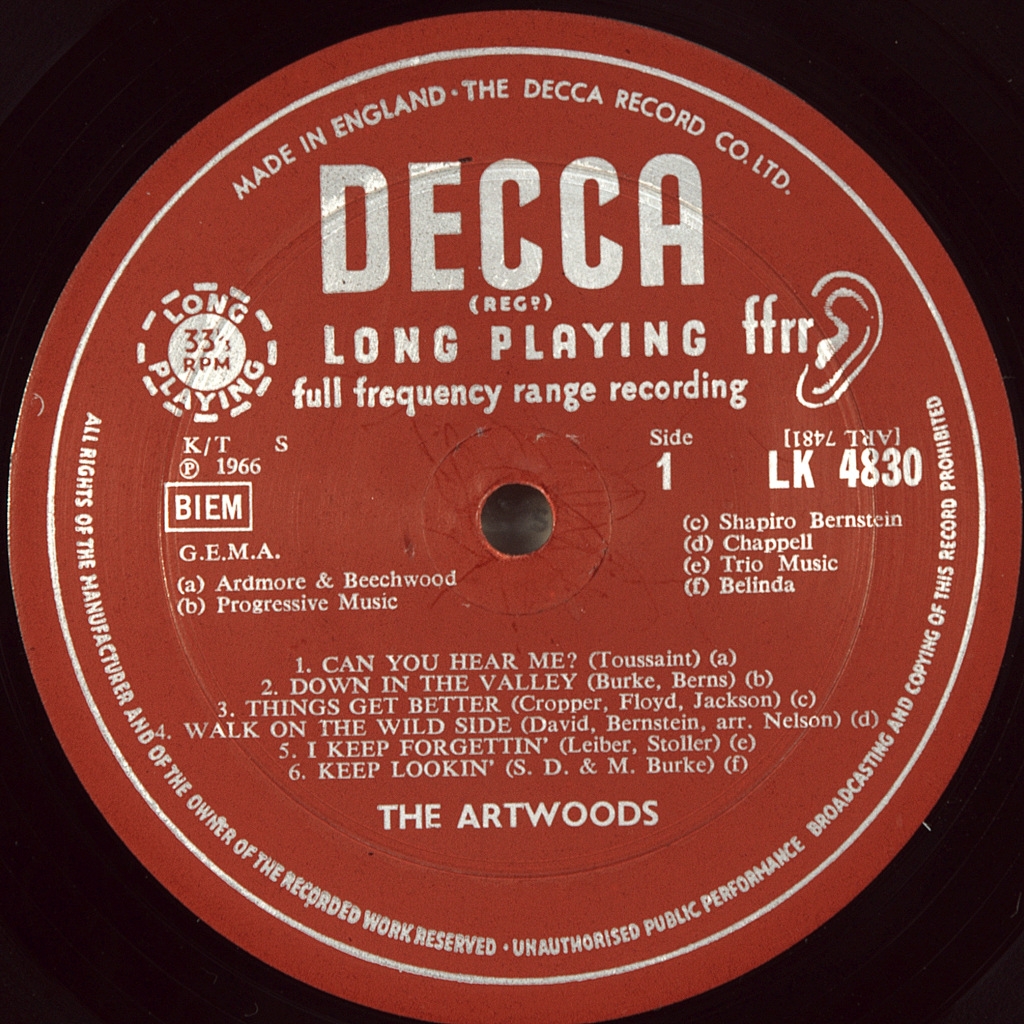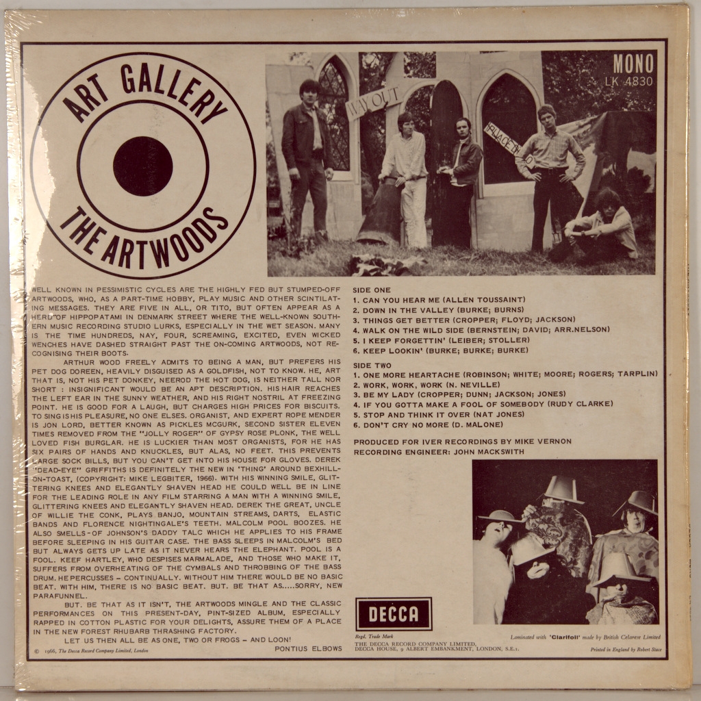 ARTWOODS-ART GALLERY-1966-FIRST PRESS UK-DECCA-LK4830. Matrices A-1A/B-1A. Mega rare original of the cult album. Artwoods is a British rock band formed in 1963 and worked between 1964 and 1967.Singer Arthur Wood, from whom the band took its name, was the older brother of Ronnie Wood (who later became famous thanks to Faces and Rolling Stones). Art Wood was the lead singer of Alexis Korner's Blues Incorporated for a short period in 1962, while also leading his own band ART WOOD COMBO. When keyboardist Jon Lord (later founded DEEP PURPLE) and guitarist Derek Griffiths of Red Bludd's Bluesicians joined the ART WOOD COMBO, ARTWOODS was formed. They were very popular competing with the ANIMALS group, but sales did not reflect this popularity.