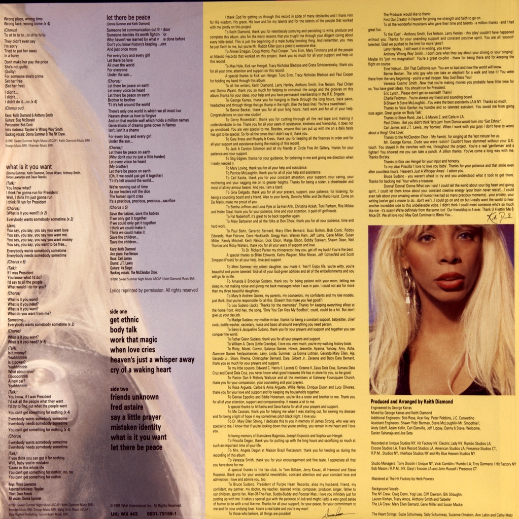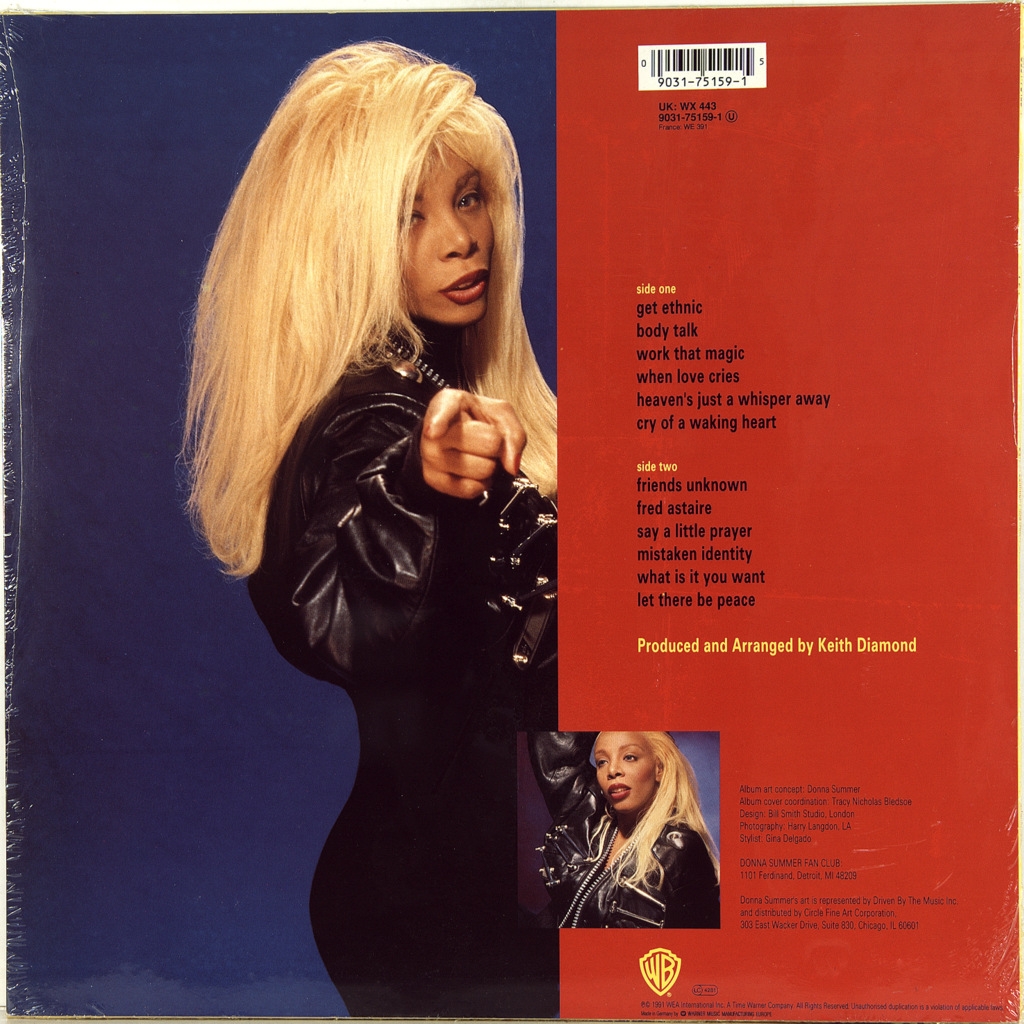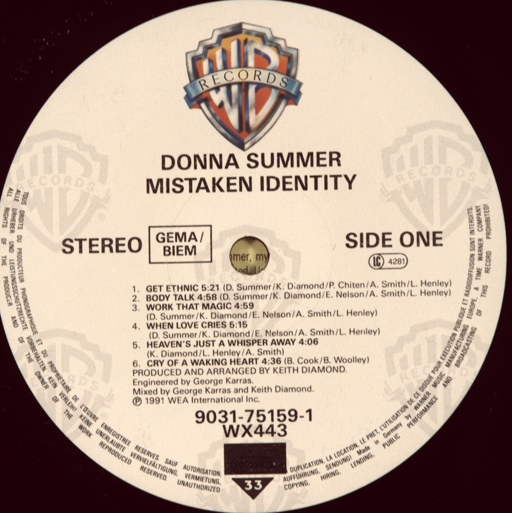 DONNA SUMMER - MISTAKEN IDENTITY-1991-FIRST PRESS UK/EU-GERMANY-WARNER-WX443. A rare original of the queen of soul disco. Mistaken Identity is the fourteenth studio album by American singer Donna Summer, released on August 23, 1991 on Atlantic Records. In the new record, Summer continues to experiment with various musical genres, this time the album is recorded in an urban style. However, the album becomes one of the most disastrous releases in Donna Summer's career, it does not enter either the UK Albums Chart or the US Billboard 200. Two singles were released from the album: "When Love Cries", which reached number 77 on the Billboard Hot 100 singles chart and number 18 on the Billboard RB charts; and "Work That Magic", was released as a single in the UK, where it reached number 74 on the UK Singles Chart.