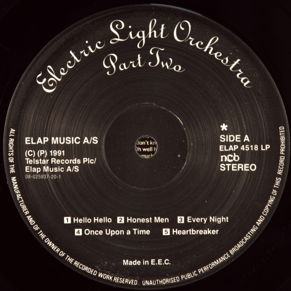 ELECTRIC LIGHT ORCHESTRA-PART TWO-1991-THE FIRST PRESS OF EU-ELAP-4518. ELO Part II is a band created by Electric Light Orchestra drummer and co-founder Bev Bevan. The band also included former ELO bassist and vocalist Kelly Grukatti, violinist Mick Kaminsky for most of his career, as well as conductor Louis Clark, who toured as a guest with ELO in its final years. After Bevan left the band at the end of 1999, he sold his half of the rights to the Electric Light Orchestra name to Jeff Lynn, and the band changed its name to Orchestra. Electric Light Orchestra Part Two is the debut album by ELO Part II, released in 1991. In March 1991, the single "Honest Men" reached number 60 in the UK Singles chart and 36th in the Dutch Top 40 chart.