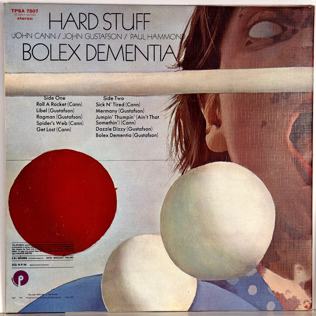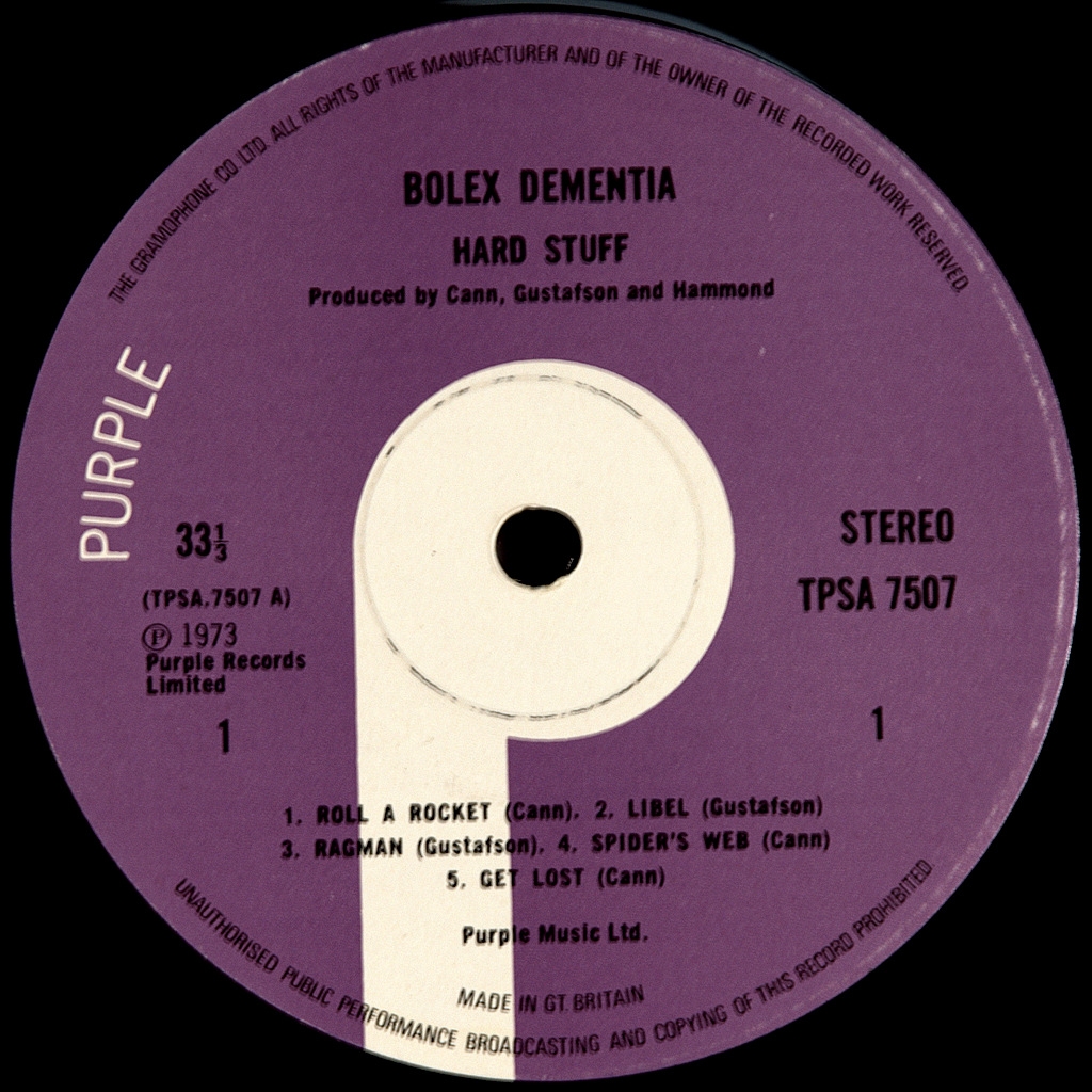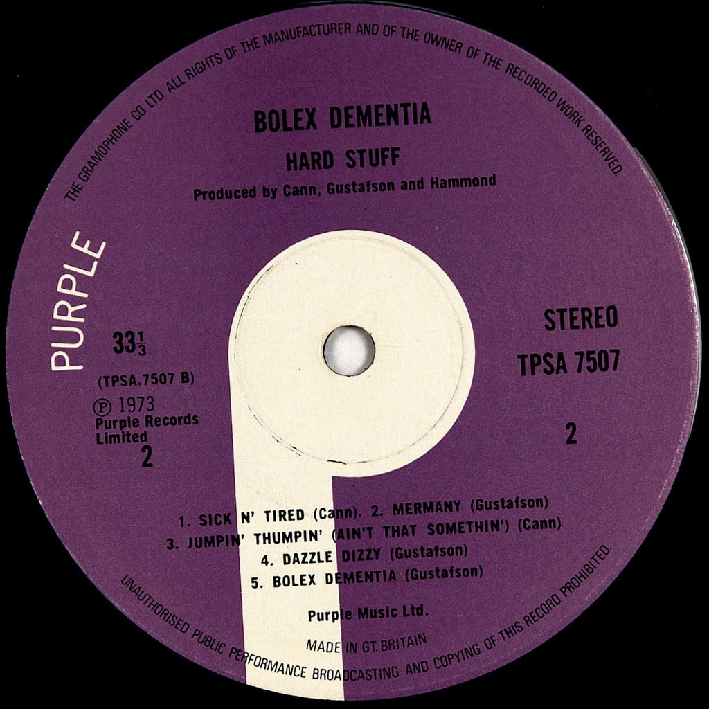 HARD STUFF-BOLEX DEMENTIA-1973-THE FIRST UK-PURPLE -TPSA7507 matrix A-2U/B-3U PRESS. Stamper 1G/1R (Dream!!!!!) The second album of the hard prog British band consisting of great musicians JOHN CANN, JOHN GUSTAFSON, PAUL HAMMOND. It is the second and final album by the 1970s British rock band HARD STUFF. During the recording of the album, two band members (John Cann and Paul Hammond) were injured in a serious car accident in Belgium. Cann was sitting in the front passenger seat of their car. Ford Zodiac and suffered a back injury and broken ribs, while Hammond, who was sleeping in the back seat, broke both legs. Kahn spent a week in the hospital in Ostend, and Hammond spent two months.[1]