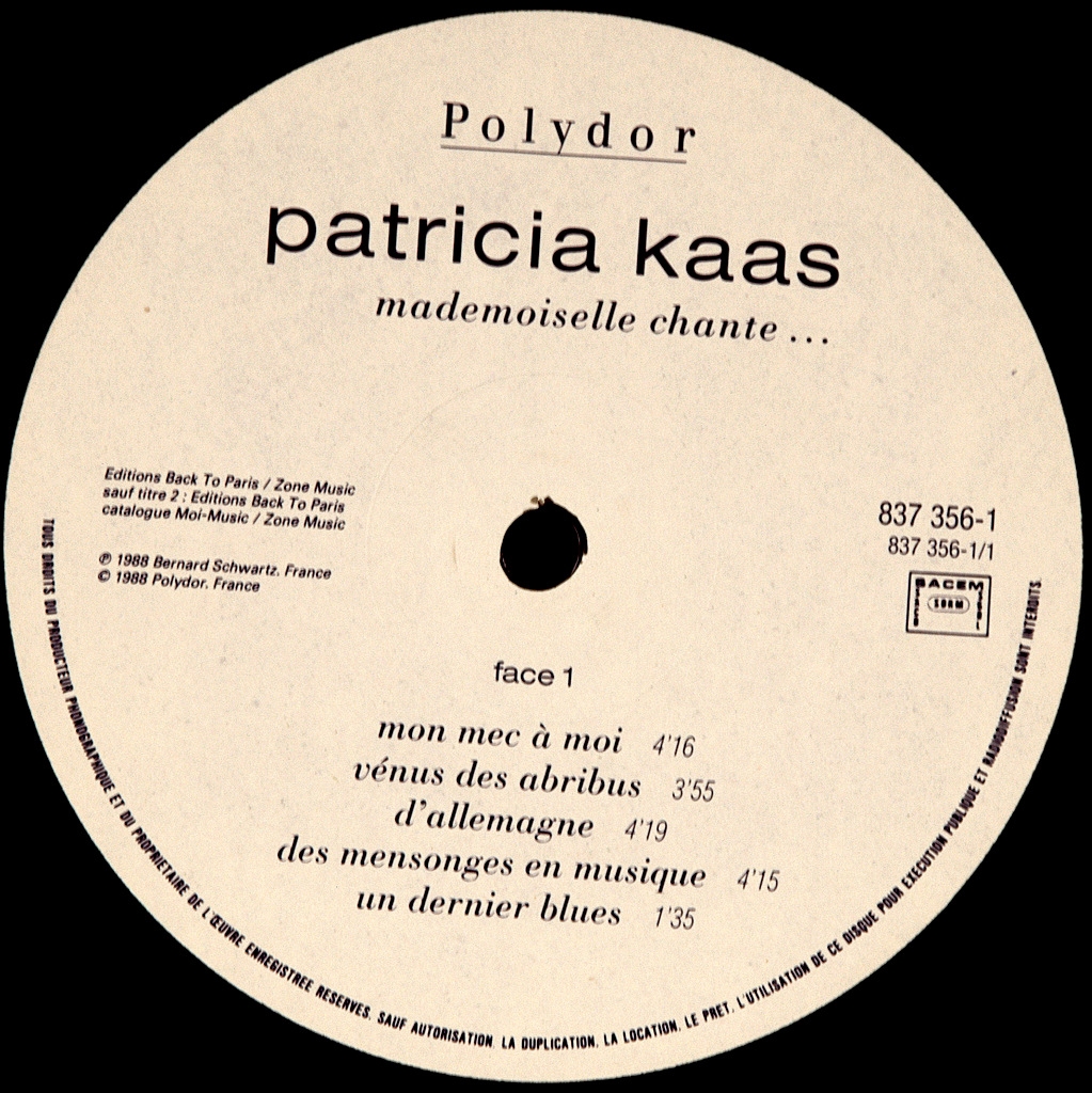 KAAS,PATRICIA-MADEMOISELLE CHANTE...IN 1988-FRANCE FIRST PRESS-POLYDOR-837356-1. Rare French original stars of pop music. Mademoiselle chante... is an album recorded in 1987 by the French singer Patricia Kaas . It was her debut album, which was preceded by the singles "Mademoiselle chante le blues"and" D Allemagne". Three top 10 singles were certified silver disc for more than 200,000 copies sold for each of them. It was the only album Kaas, published by Polydor (the next albums were published by Sony and Columbia). The album went to #19 4 December 1988, a month later reached the top ten and reached # 2 in the French album charts, remaining there for two consecutive months. It remained in the top ten a total of 64 weeks and 118 weeks in the top 100. The album was also certified platinum in Belgium and double platinum in Switzerland [9] and gold in Canada .[10] completely Miss Shant... currently sold over 2 million copies worldwide.