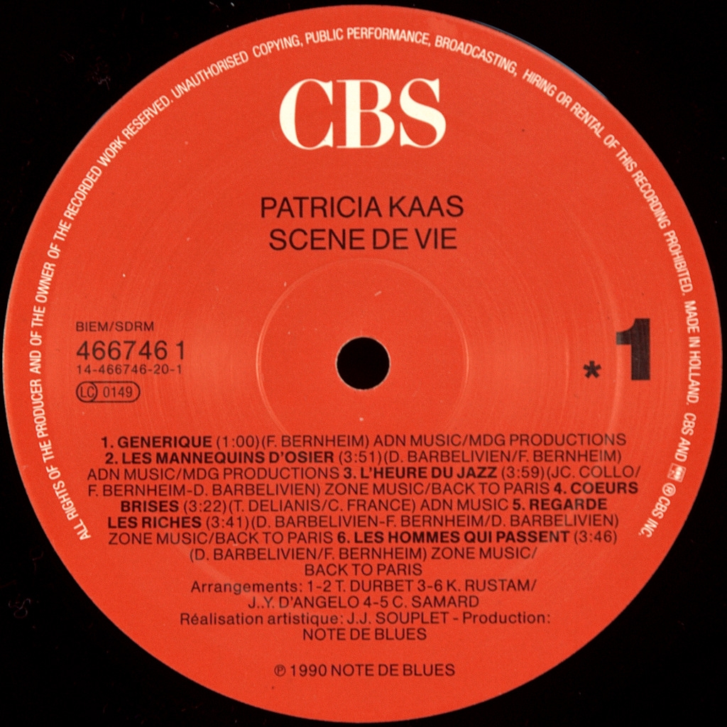 KAAS,PATRICIA-SCENE DE VIE...- 1990-THE FIRST PRESS HOLLAND-CBS-4667461. A rare European original of a pop pop star. Scène de vie (English: Moments in Life) is a studio album by French artist Patricia Kaas. It was her second album, released in 1990. This confirmed the singer's potential, reaching the top of the album chart in France. In France, Scène de vie climbed to number 2 on May 10, 1990, and then reached the top of the album chart and stayed there for ten weeks. It spent 38 weeks in the top ten and 78 weeks in the top 50.[3] It became a diamond disc eight years after its release, just as Mademoiselle Chante did... before him. In Switzerland, the album entered the charts on May 6, 1990 at number 17 and reached a peak position of 15. It remained on the chart for six weeks, and then replenished for another 16 weeks, from January 20 to May 5, 1991, entering the top 30 for eight weeks.[5] It was certified double platinum in 1993. The album also went platinum in Canada, going gold on March 28, 1991