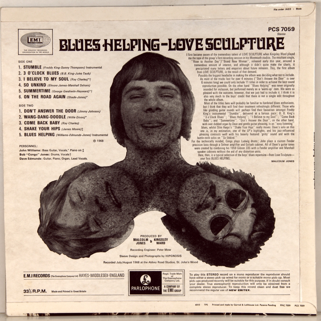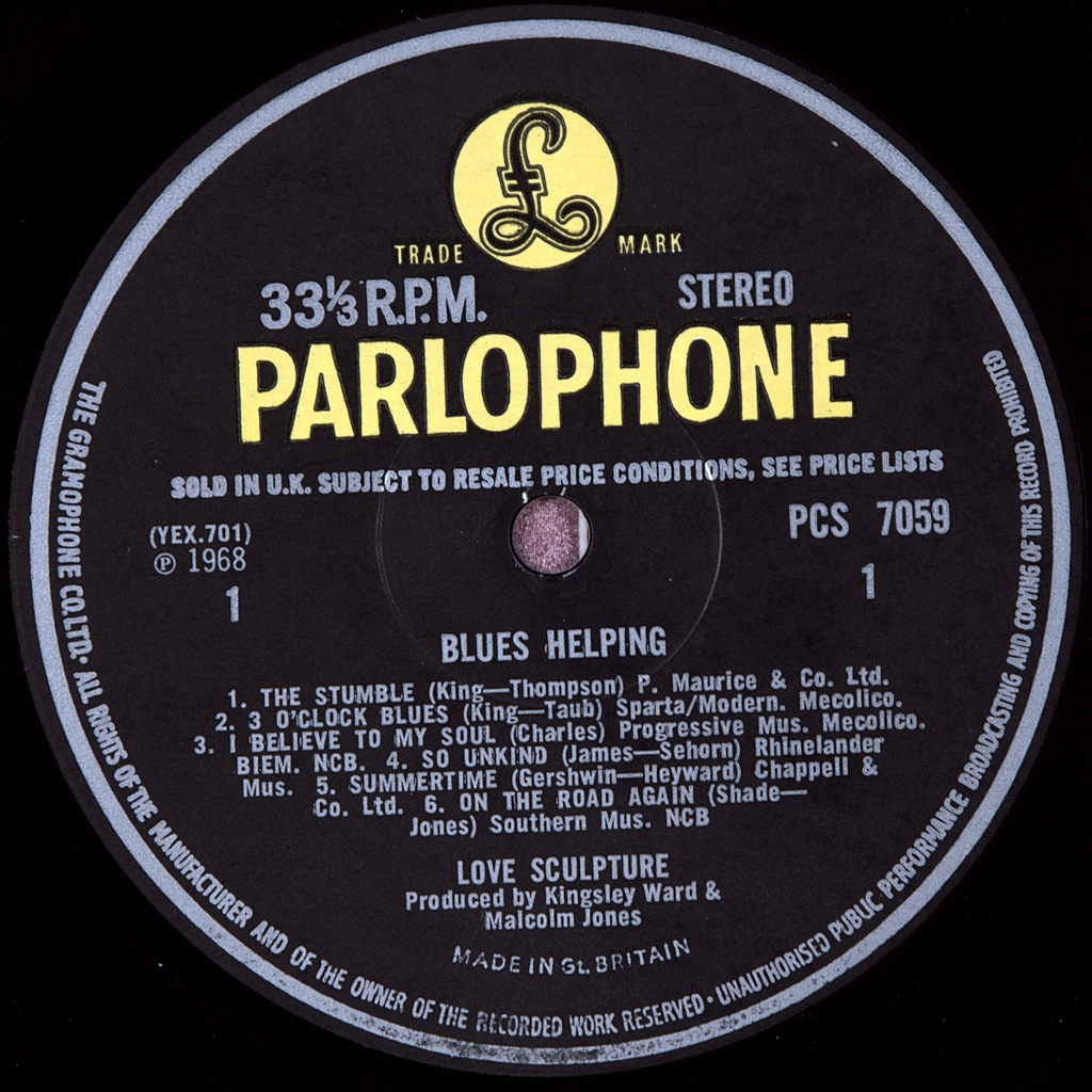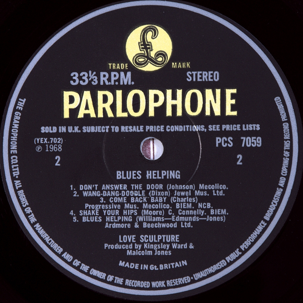 LOVE SCULPTURE-BLUES HELPING-1968-FIRST PRESS UK-PARLOPHONE-PCS7059. A very rare British original of the cult band. Their debut album Blues Helping included the songs "Summertime" and "Wang Dang Doodle".