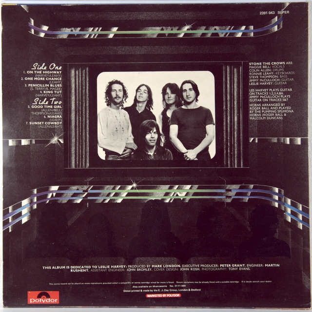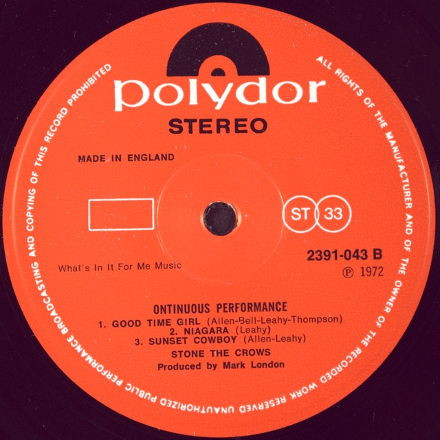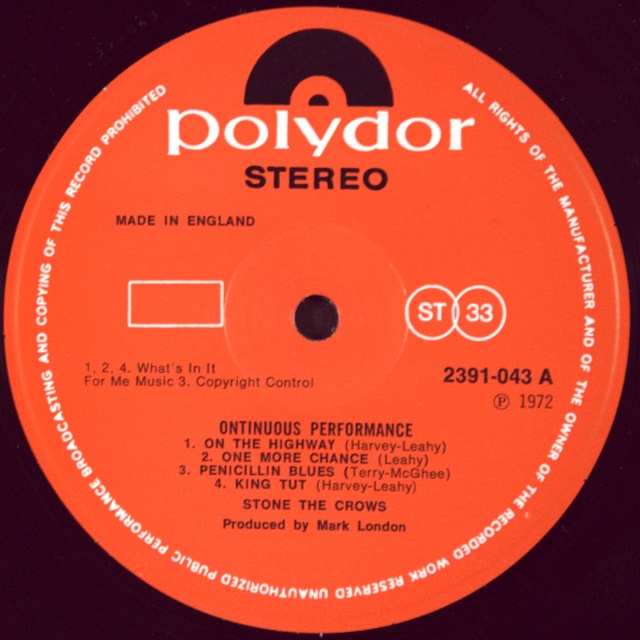 STONE THE CROWS-ONTINUOUS PERFORMANCE-1972-First press UK-POLYDOR -2391 043 Matrix A-1/B-1. A rare British original of the cult blues-prog band. The fourth album of the band made in the best traditions and level of British blues rock of the 70s This is the band's last album, as guitarist Les Harvey tragically died from an electric shock on stage. Since Peter Grant was one of the leaders of the band, he continued to work with vocalist Meggie Bell on solo works.