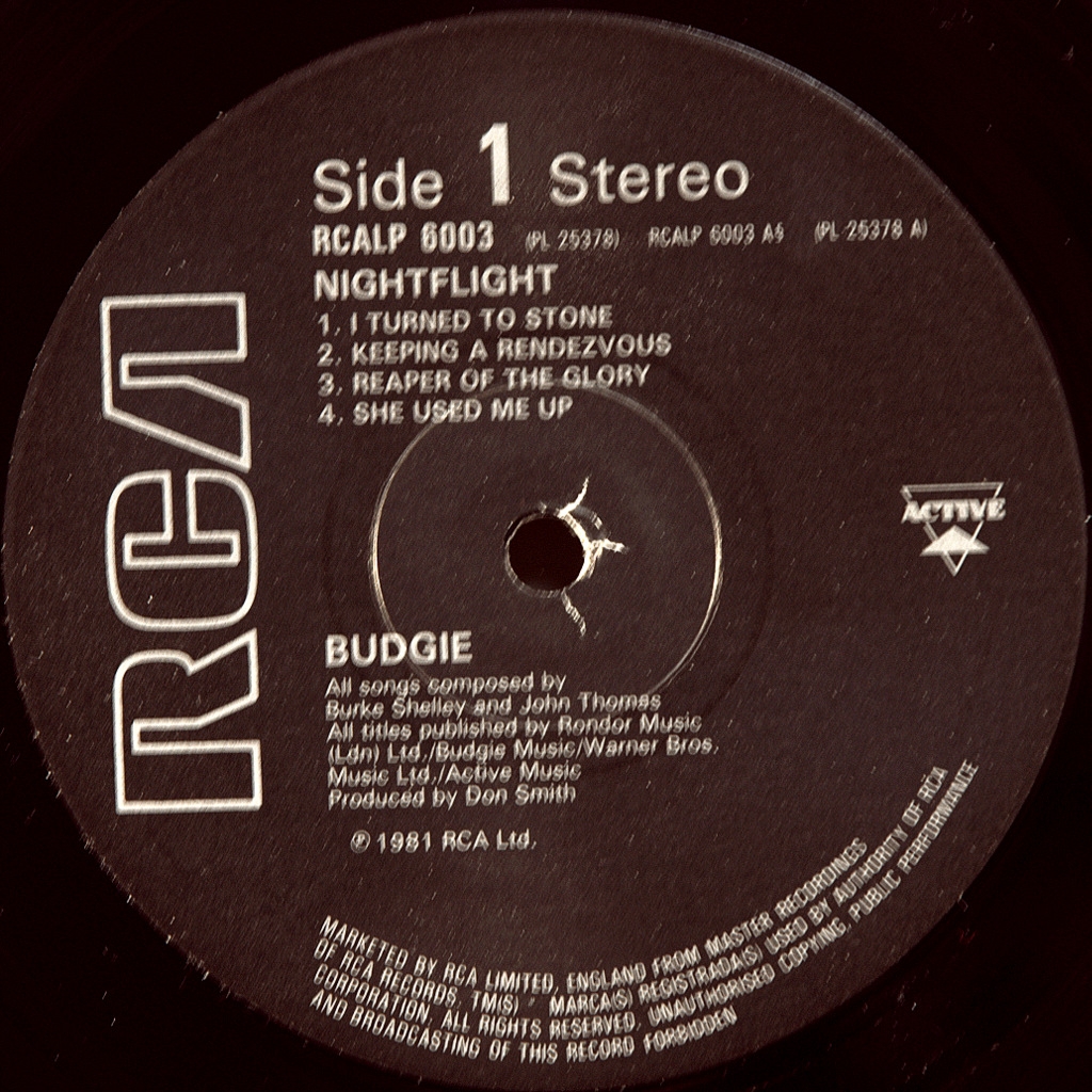 BUDGIE-NIGHTFLIGHT-1981-THE FIRST UK PRESS-RCA-6003. A rare British original of the cult group. Nightflight is Budgie's ninth album, released in October 1981 on RCA Records. The cover art is by Derek Riggs. The album turned out to be of high quality with the sound of early works, which allowed it to re-enter the British charts.