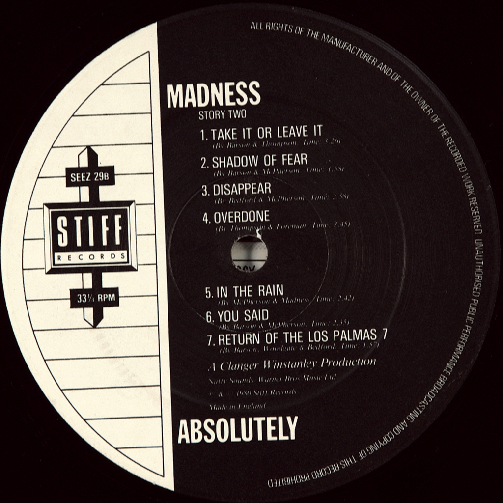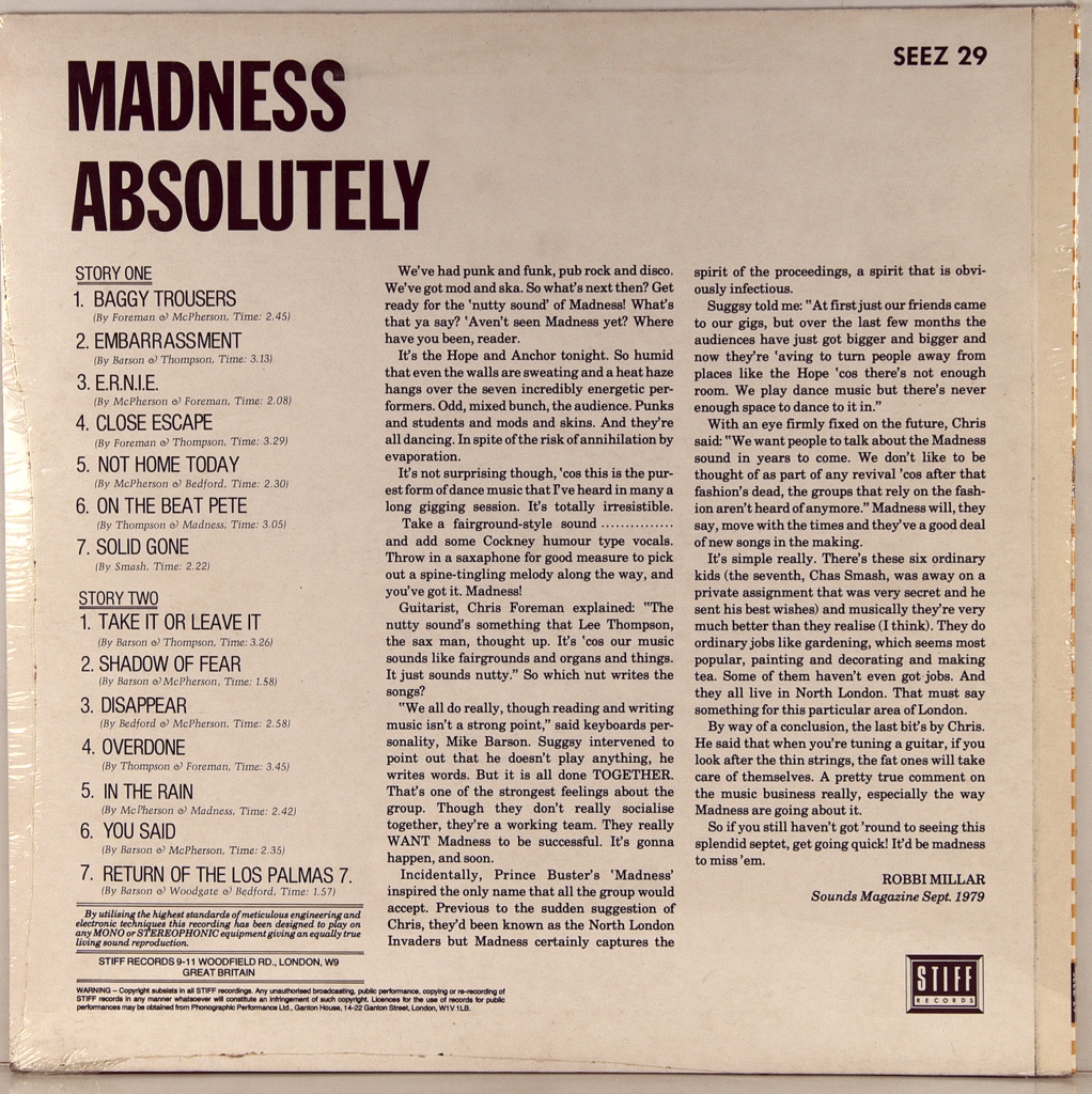 MADNESS-ABSOLUTELY-1980-THE FIRST UK-STIFF-SEEZ29 PRESS. A rare British original of the cult album. Absolute is the second album by the British ska band Madness released in 1980. The album reached number 2 in the UK charts. Absolute spawned some of the band's biggest hits, most notably "BaggyPants", which peaked at number 3 in the UK and spent over four months on the singles chart. "Confusion" took 4th place, and the instrumental "The Return of the Los Palmas 7" rose to 7th place. Although reviews of the album, as a rule, were less enthusiastic than those of One Step Beyond...