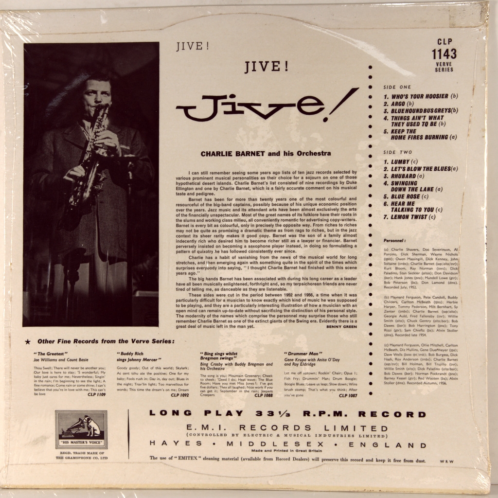 CHARLIE BARNET AND HIS ORCH.-JIVE,JIVE,JIVE-1957-FIRST PRESS UK-HIS MASTER'S VOICE-CLP1143. A rare British original of a cult jazz album in archival condition. Charles Daly Barnett (October 26, 1913 – September 4, 1991) was an American jazz saxophonist, composer, and bandleader. His main recordings were "Skyliner", "Cherokee", "The Wrong Idea", "Scotch and Soda", "In a Mizz" and "Southland Shuffle".