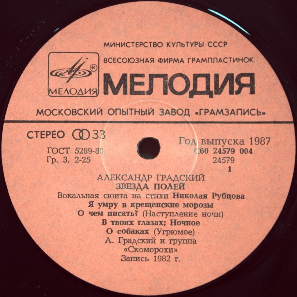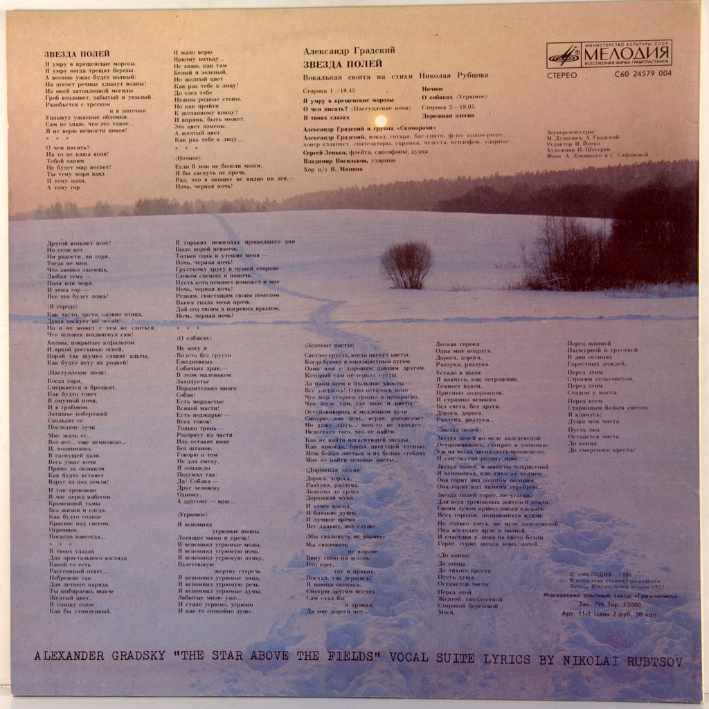 GRADSKY, ALEXANDER -THE STAR OF THE FIELDS -1987-THE FIRST PRESS OF THE USSR-MELODIA-C6024579004. A rare original of the cult album. The Star of the Fields (vocal suite, music by A. Gradsky, poems by N. Rubtsov, recorded in 1987).Alexander Borisovich Gradsky (born Fradkin; b. November 3, 1949, Kopeysk, Chelyabinsk region, RSFSR, USSR) — Soviet and Russian singer, multi-instrumentalist, songwriter, poet, composer. One of the founders of Russian rock. Honored Artist of the Russian Federation (1997). Laureate of the State Prize of the Russian Federation (1999). People's Artist of the Russian Federation (1999). People's Artist of the Pridnestrovian Moldavian Republic (2014). Artistic Director of the Gradsky Hall Theater.
