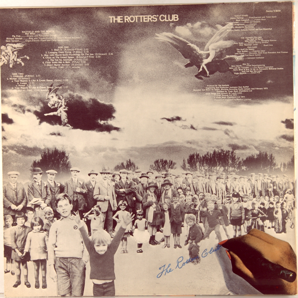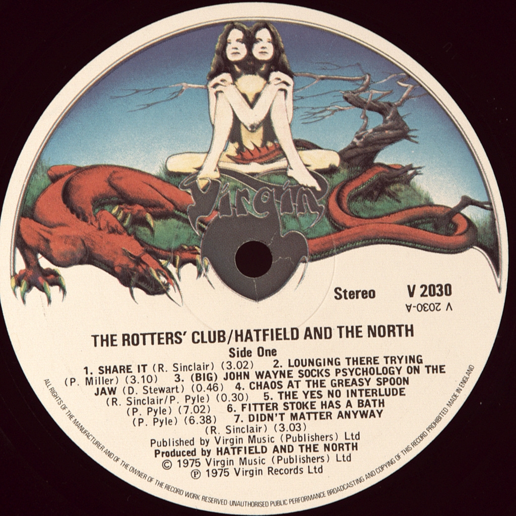 HATFIELD AND THE NORTH-ROTTERS CLUB-1975-THE FIRST UK-VIRGIN-V2030 PRESS. Matrices A-1U/B-1U. 1M/1GA stamper (a dream!) A rare British original of the famous art-prog band The Rotters' Club is the second studio album by the Canterbury stage band Hatfield and the North, released in 1975. The album continues the traditions of the psychedelic jazz-rock of the band's first album with the lead role of Dave Stewart's keyboard parts. The most notable composition was Stewart's 20-minute "Mumps". The album ranks 9th in the ranking of the best albums of the Canterbury scene, compiled based on the ratings of visitors to the site Progarchives.com (as of April 2013)