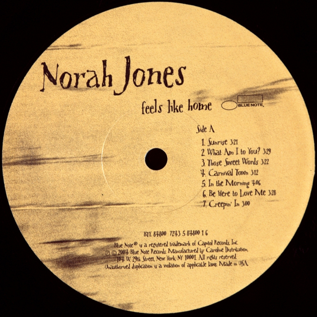 NORAH JONES -FEELS LIKE HOME-2004-FIRST PRESS USA- BLUE NOTE-7243584800-16. Rare American original of the cult album. Feels like Home is the second studio album by American singer-songwriter Nora Jones, released on February 10, 2004 by Blue Note Records. It is a follow-up to Jones' 2002 breakthrough album "Come Away with Me". At the 47th Annual Grammy Awards, the album was nominated for Best Pop Vocal Album. "Sunrise", the album's lead single, won the Grammy Award for Best Female Pop Vocal Performance. The song "Creepin' In" featuring Dolly Parton was also nominated for a Grammy Award in the category "Best Country Collaboration with Vocals".