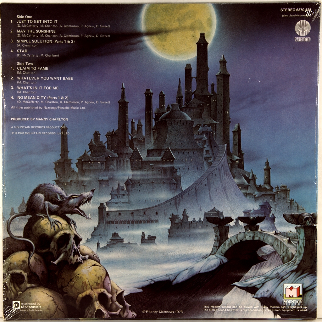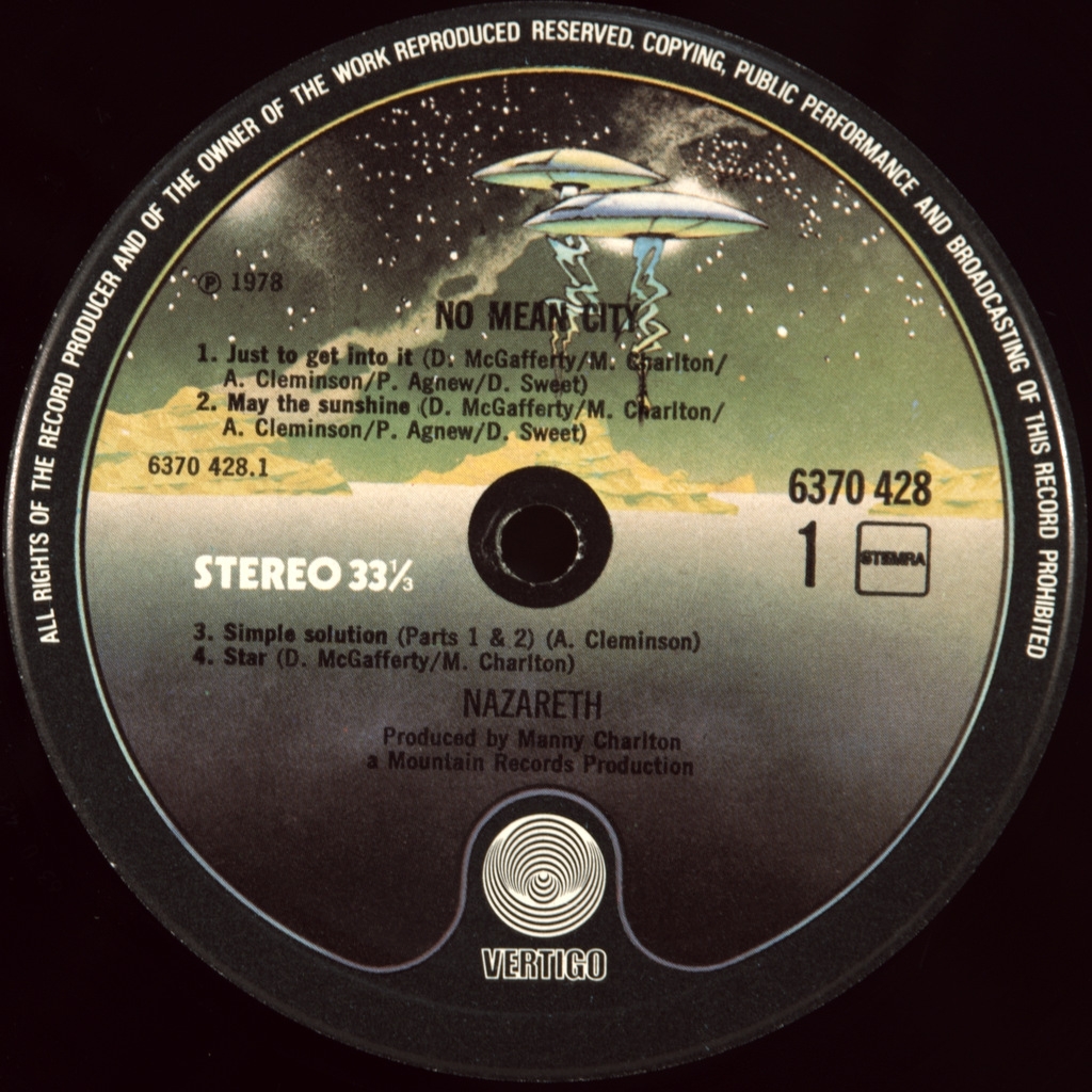 NAZARETH,NO MEAN CITY-1978- THE FIRST HOLLAND-VERTIGO PRESS number 6370428. A rare European original. The tenth studio album by the band Nazareth. The album cover was drawn by Rodney Matthews, a famous English fantasy illustrator who created covers for the works of many other artists (Scorpions, Thin Lizzy and others) The name of the disc is borrowed from the novel "No Mean City" (1935) by Alexander MacArthur and Kingsley Long. With this album, the band's sound has become heavier, given the addition of guitarist Zal Cleminson from Sensational Alex Harvey Band. The popularity of the album allowed the band to perform with several big names, such as Thin Lizzy, on their 1978/79 tour.