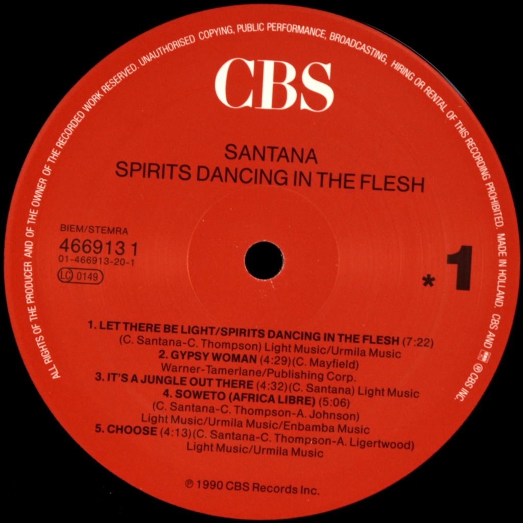 SANTANA-SPIRITS DANCING IN THE FLESH-1990-FIRST PRESS UK/EU-HOLLAND-CBS-466913-1 Very rare original. Santana's sixteenth studio album, released in 1990. The album turned out to be rock psychedelic going back to the origins of creativity. The album reached 85 on the Billboard 200. Rolling stones magazine rated the album 4 stars.
